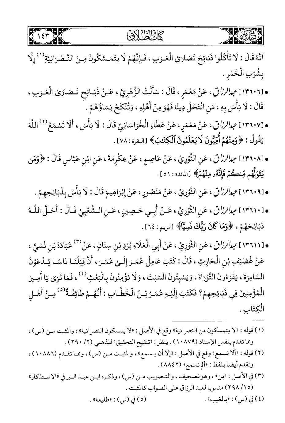 • [١٣٦١١] عبد الرزاق، عَنِ الثَّوْريِّ، عَنْ أَبِي الْعَلَاءِ بُرْدِ بْنِ سِنَانٍ، عَنْ (¬٣) عُبَادَةَ بْنِ نُسَيٍّ، عَنْ غُضَيْفِ بْنِ الْحَارِثِ، قَالَ: كَتَبَ عَامِلُ عُمَرَ إِلى عُمَرَ، أَنَّ قِبَلَنَا نَاسًا يُدْعَوْنَ السَّامِرَةَ، يَقْرَءُونَ التَّوْرَاةَ، وَيَسْبِتُونَ السَّبْتَ، وَلَا يُؤْمِنُونَ بِالْبَعْثِ (¬٤)، فَمَا تَرَى يَا أَمِيرَ الْمُؤْمِنِينَ فِي ذَبَائِحِهِمْ؟ فَكَتَبَ إِلَيْهِ عُمَرُ بْنُ الْخَطَّابِ: أَنَّهُمْ طَائِفَةٌ (¬٥) مِنْ أَهْلِ الْكِتَابِ.