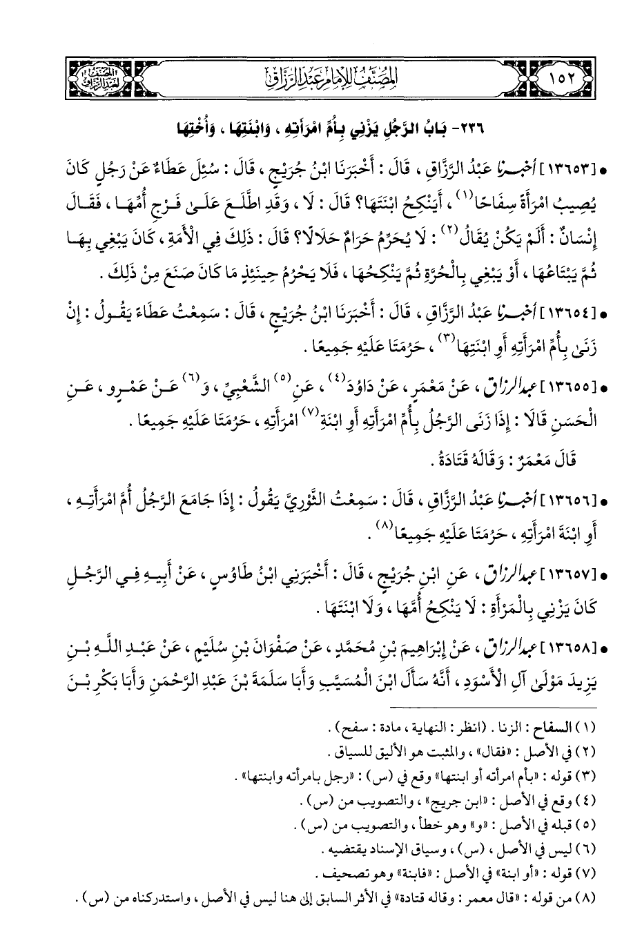 • [١٣٦٥٦] أخبرنا عَبْدُ الرَّزَّاقِ، قَالَ: سَمِعْتُ الثَّوْريَّ يَقُولُ: إِذَا جَامَعَ الرَّجُلُ أُمَّ امْرَأَتِهِ، أَوِ ابْنَةَ امْرَأَتِهِ، حَرُمَتَا عَلَيْهِ جَمِيعًا (¬٨).
