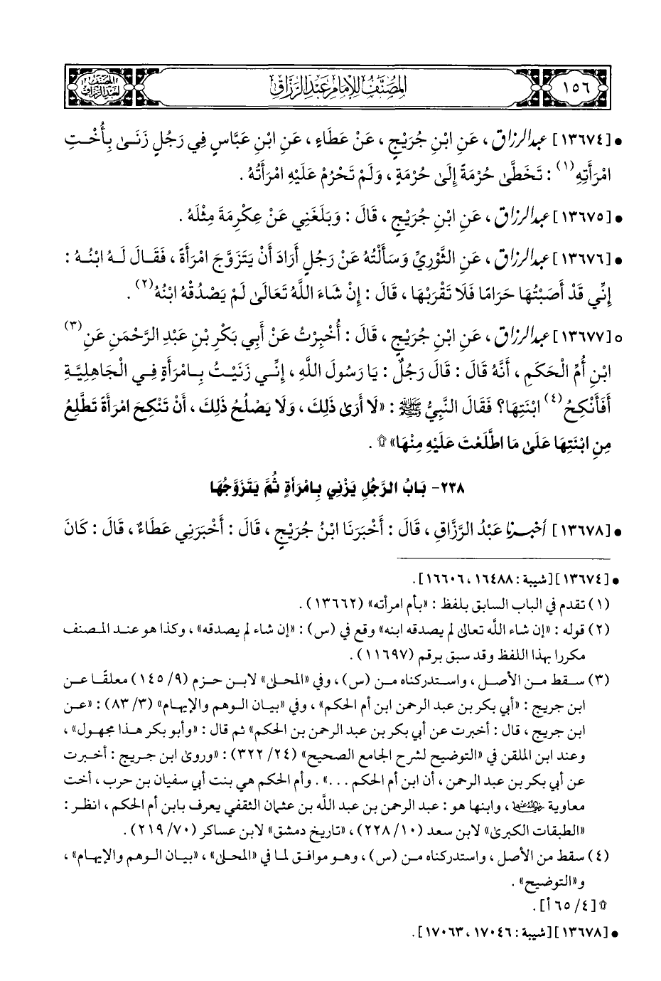 (¬٣) سقط من الأصل، واستدركناه من (س)، وفي "المحلى" لابن حزم (٩/ ١٤٥) معلقا عن ابن جريج: "أبي بكر بن عبد الرحمن ابن أم الحكم"، وفي "بيان الوهم والإيهام" (٣/ ٨٣): "عن ابن جريج، قال: أخبرت عن أبي بكر بن عبد الرحمن بن الحكم" ثم قال: "وأبو بكر هذا مجهول"، وعند ابن الملقن في "التوضيح لشرح الجامع الصحيح" (٢٤/ ٣٢٢): "وروى ابن جريج: أخبرت عن أبي بكر بن عبد الرحمن، أن ابن أم الحكم ... ". وأم الحكم هي بنت أبي سفيان بن حرب، أخت معاوية - رضي الله عنهما -، وابنها هو: عبد الرحمن بن عبد الله بن عثمان الثقفي يعرف بابن أم الحكم، انظر: "الطبقات الكبرى" لابن سعد (١٠/ ٢٢٨)، "تاريخ دمشق" لابن عساكر (٧٠/ ٢١٩).