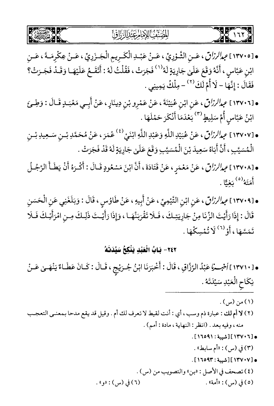 • [١٣٧٠٦] عبد الرزاق، عَنِ ابْنِ عُيَيْنَةَ، عَنْ عَمْرِو بْنِ دِينَارٍ، عَنْ أَبِي مَعْبَدٍ قَالَ: وَطِئَ ابْنُ عَبَّاسٍ أُمَّ سَلِيطٍ (¬٣) بَعْدَمَا أَنْكَرَ حَمْلَهَا.