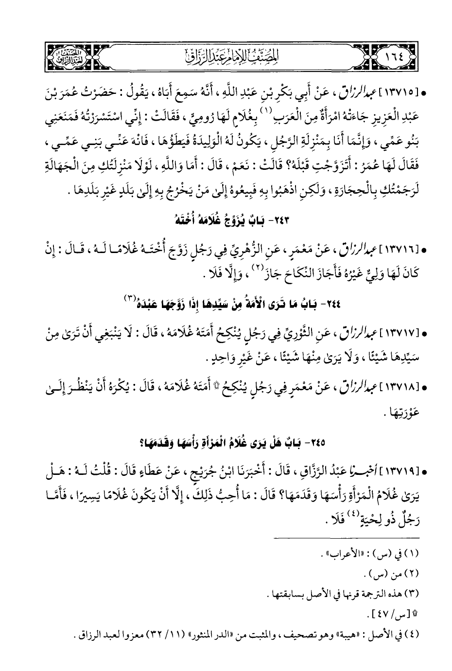 • [١٣٧١٩] أخبرنا عَبْدُ الرَّزَّاقِ، قَالَ: أَخْبَرَنَا ابْنُ جُرَيْجٍ، عَنْ عَطَاءٍ قَالَ: قُلْتُ لَهُ: هَلْ يَرَى غُلَامُ الْمَرْأَةِ رَأْسَهَا وَقَدَمَهَا؟ قَالَ: مَا أُحِبُّ ذَلِكَ، إِلَّا أَنْ يَكُونَ غُلَامًا يَسِيرًا، فَأَمَّا رَجُلٌ ذُو لِحْيَةٍ (¬٤) فَلَا.