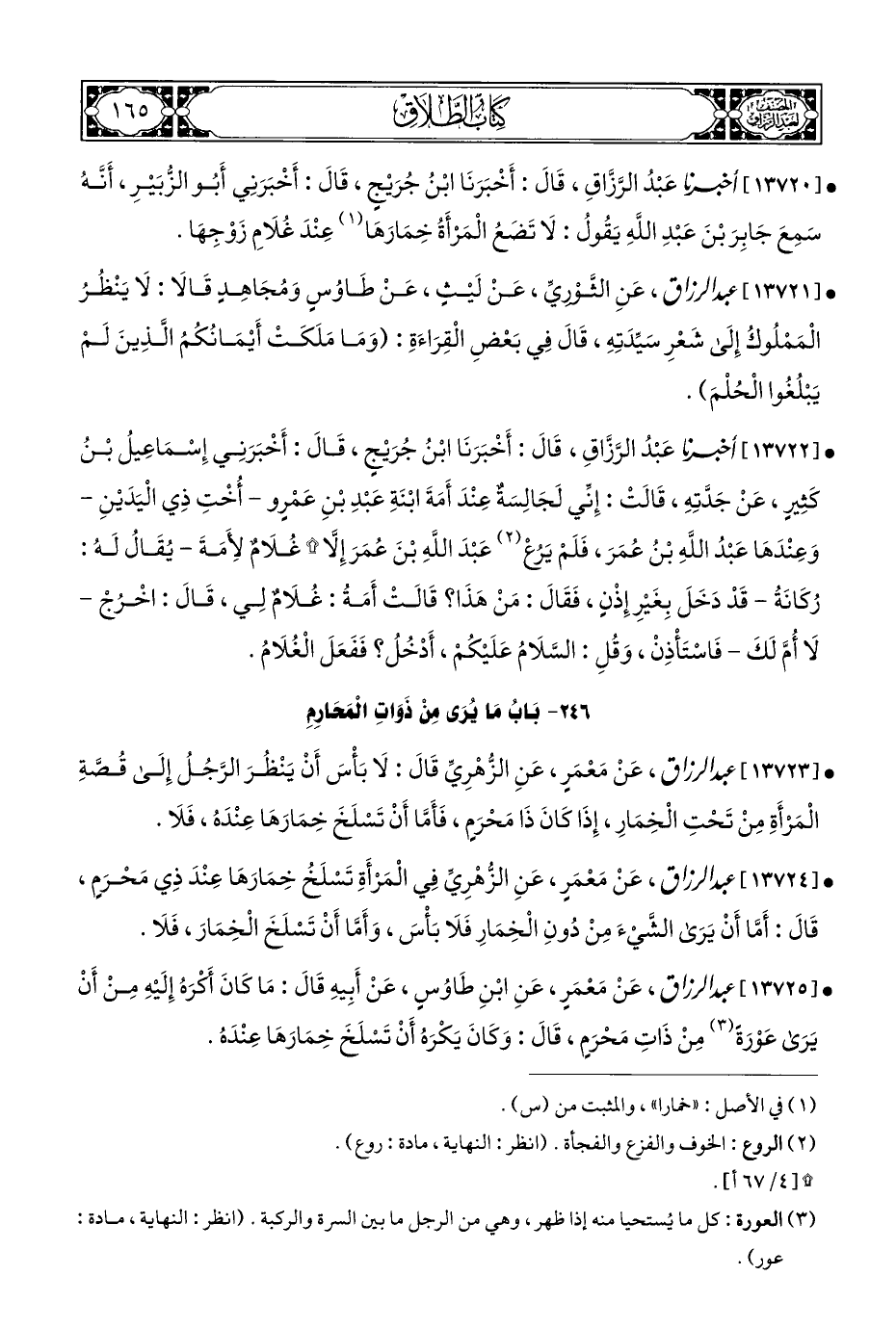 • [١٣٧٢٠] أخبرنا عَبْدُ الرَّزَّاقِ، قَالَ: أَخْبَرَنَا ابْنُ جُرَيْجٍ، قَالَ: أَخْبَرَنِي أَبُو الزُّبَيْرِ، أَنَّهُ سَمِعَ جَابِرَ بْنَ عَبْدِ اللَّهِ يَقُولُ: لَا تَضَعُ الْمَرْأَةُ خِمَارَهَا (¬١) عِنْدَ غُلَامِ زَوْجِهَا.