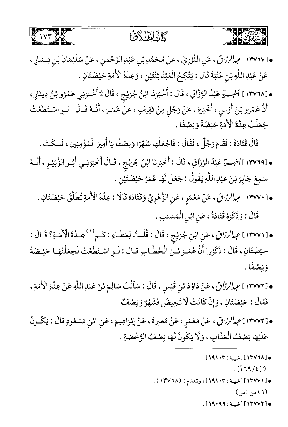 • [١٣٧٦٩] أخبرنا عَبْدُ الرَّزَّاقِ، قَالَ: أَخْبَرَنَا ابْنُ جُرَيْجٍ، قَالَ أَخْبَرَنِي أَبُو الزُّبَيْرِ، أَنَّهُ سَمِعَ جَابِرَ بْنَ عَبْدِ اللَّهِ يَقُولُ: جَعَلَ لَهَا عُمَرُ حَيْضَتَيْنِ.