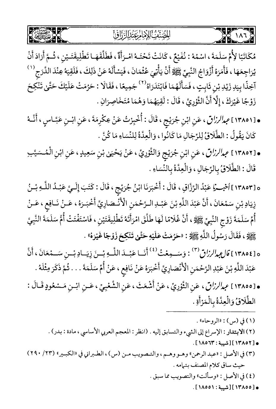 ° [١٣٨٥٣] أخبرنا عَبْدُ الرَّزَّاقِ، قَالَ: أَخْبَرَنَا ابْنُ جُرَيْجٍ، قَالَ: كَتَبَ إِلَيَّ عَبْدُ اللَّهِ بْنُ زِيَادِ بْنِ سَمْعَانَ، أَنَّ عَبْدَ اللَّهِ بْنَ عَبْدِ الرَّحْمَنِ الْأَنْصارِيَّ أَخْبَرَهُ، عَنْ نَافِعٍ، عَنْ أُمِّ سَلَمَةَ زَوْجِ النَّبِي - صلى الله عليه وسلم -، أَن غُلَامًا لَهَا طَلَّقَ امْرَأَتَهُ تَطْلِيقَتَيْنِ، فَاسْتَفْتَتْ أُمُّ سَلَمَةَ النَّبِيَّ - صلى الله عليه وسلم -، فَقَالَ رَسُولُ اللَّهِ - صلى الله عليه وسلم -: "حَرُمَتْ عَلَيْهِ حَتَّى تَنْكِحَ زَوْجًا غَيْرَهُ".