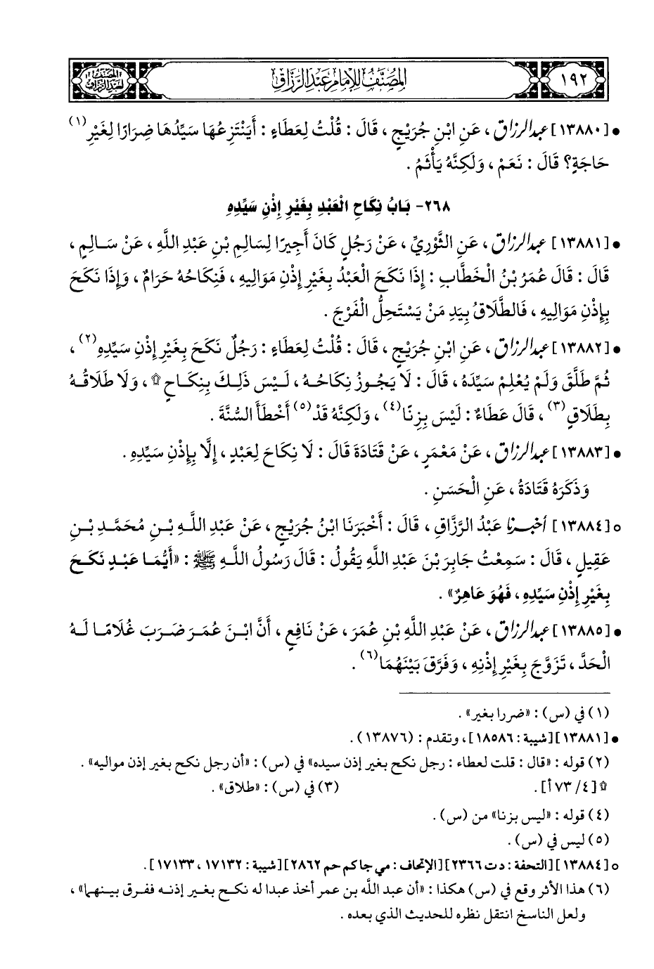 (¬٦) هذا الأثر وقع في (س) هكذا: "أن عبد الله بن عمر أخذ عبدا له نكح بغير إذنه ففرق بينهما"، ولعل الناسخ انتقل نظره للحديث الذي بعده.