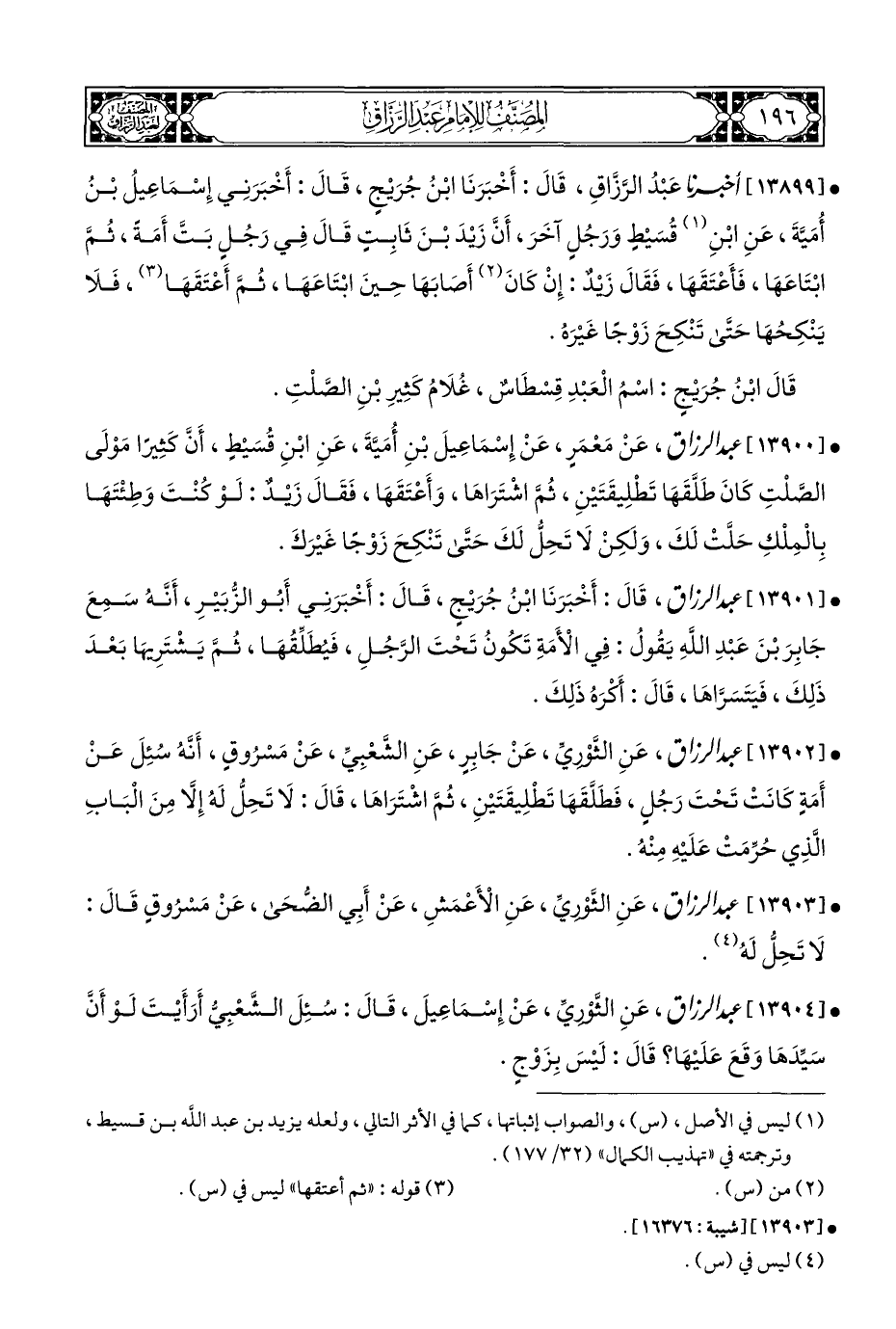 • [١٣٨٩٩] أخبرنا عَبْدُ الرَّزَّاقِ، قَالَ: أَخْبَرَنَا ابْنُ جُرَيْجٍ، قَالَ: أَخْبَرَنِي إِسْمَاعِيلُ بْنُ أميَّةَ، عَنِ ابْنِ (¬١) قُسَيْطِ وَرَجُلٍ آخَرَ، أَنَّ زَيْدَ بْنَ ثَابِتٍ قَالَ فِي رَجُلٍ بَتَّ أَمَةَ، ثُمَّ ابْتَاعَهَا، فَأَعْتَقَهَا، فَقَالَ زَيْدٌ: إِنْ كَانَ (¬٢) أَصَابَهَا حِينَ ابْتَاعَهَا، ثُمَّ أَعْتَقَهَا (¬٣)، فَلَا يَنْكِحُهَا حَتَّى تَنْكِحَ زَوْجًا غَيْرَهُ.