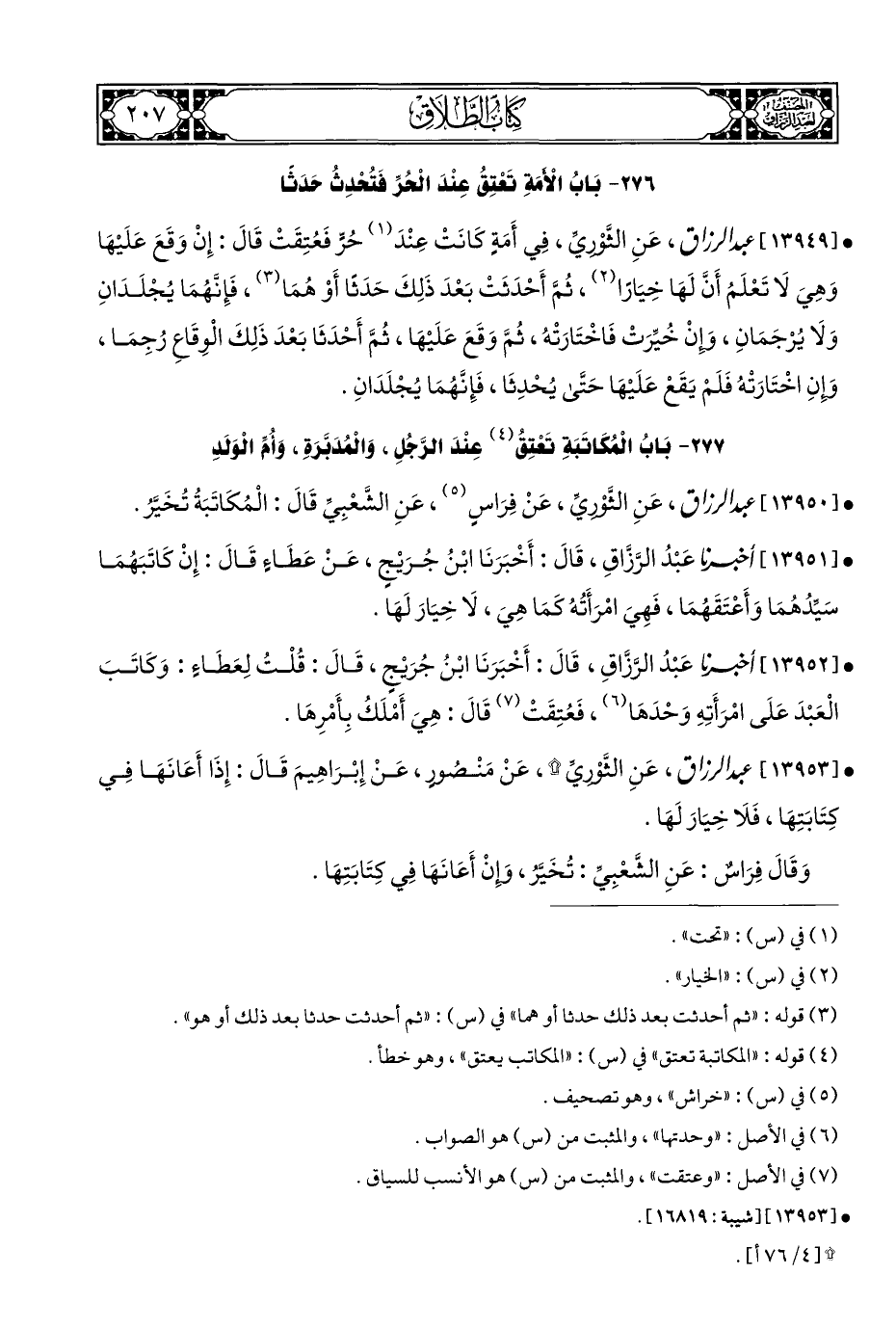 • [١٣٩٥٠] عبد الرزاق، عَنِ الثَّوْريِّ، عَنْ فِرَاسٍ (¬٥)، عَنِ الشَّعْبِيِّ قَالَ: الْمُكَاتَبَةُ تُخَيَّرُ.
