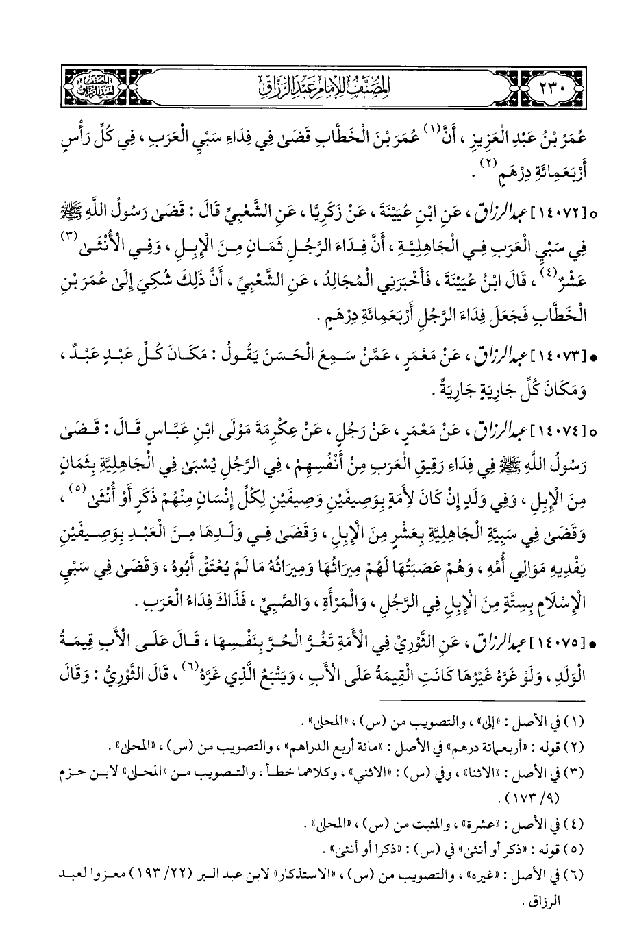° [١٤٠٧٢] عبد الرزاق، عَنِ ابْنِ عُيَيْنَةَ، عَنْ زَكَرِيَّا، عَنِ الشَّعْبِي قَالَ: قَضَى رَسُولُ اللهِ - صلى الله عليه وسلم - فِي سَبْي الْعَرَبِ فِي الْجَاهِلِيَّةِ، أَنَّ فِدَاءَ الرَّجُلِ ثَمَانٍ مِنَ الْإِبِلِ، وَفِي الْأُنْثَى (¬٣) عَشْرٌ (¬٤)، قَالَ ابْنُ عُيَيْنَةَ، فَأَخْبَرَنِي الْمُجَالِدُ، عَنِ الشَّعْبِيِّ، أَنَّ ذَلِكَ شُكِيَ إِلَى عُمَرَ بْنِ الْخَطَّابِ فَجَعَلَ فِدَاءَ الرَّجُلِ أَرْبَعَمِائَةِ دِرْهَمٍ.