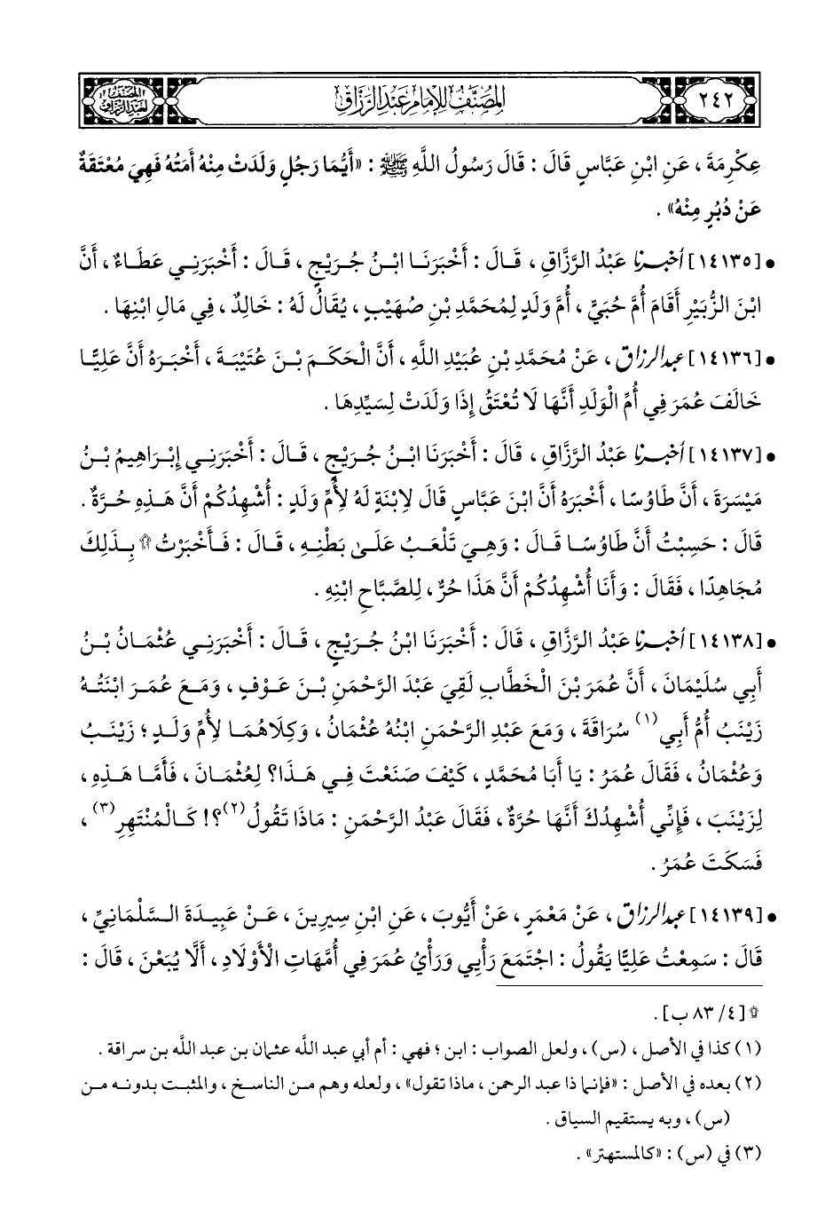 • [١٤١٣٨] أخبرنا عَبْدُ الرَّزَّاقِ، قَالَ: أَخْبَرَنَا ابْنُ جُرَيْجٍ، قَالَ: أَخْبَرَنِي عُثْمَانُ بْنُ أَبِي سُلَيْمَانَ، أَنَّ عُمَرَ بْنَ الْخَطَّابِ لَقِيَ عَبْدَ الرَّحْمَنِ بْنَ عَوْفٍ، وَمَعَ عُمَرَ ابْنَتُهُ زَيْنَبُ أُمُّ أَبِي (¬١) سُرَاقَةَ، وَمَعَ عَبْدِ الرَّحْمَنِ ابْنُهُ عُثْمَانُ، وَكِلَاهُمَا لِأُمِّ وَلَدٍ؛ زَيْنَبُ وَعُثْمَانُ، فَقَالَ عُمَرُ: يَا أَبَا مُحَمَّدٍ، كَيْفَ صنَعْتَ فِي هَذَا؟ لِعُثْمَانَ، فَأَمَّا هَذِهِ، لِزَيْنَبَ، فَإِنِّي أُشْهِدُكَ أَنَّهَا حُرَّةٌ، فَقَالَ عَبْدُ الرَّحْمَنِ: مَاذَا تَقُولُ (¬٢)؟! كَالْمُنْتَهِرِ (¬٣)، فَسَكَتَ عُمَرُ.