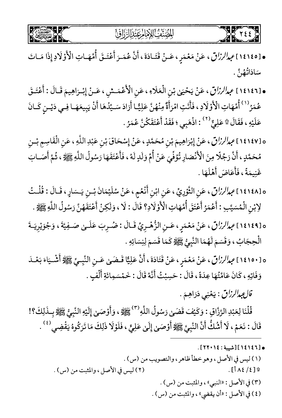 ° [١٤١٤٧] عبد الرزاق، عَنْ إِبْرَاهِيمَ بْنِ مُحَمَّدٍ، عَنْ إِسْحَاقَ بْنِ عَبْدِ اللهِ، عَنِ الْقَاسِمِ بْنِ مُحَمَّدٍ، أَنَّ رَجُلًا مِنَ الْأَنْصَارِ تُوُفِّيَ عَنْ أُمِّ وَلَدٍ لَهُ، فَأَعْتَقَهَا رَسُولُ اللهِ - صلى الله عليه وسلم -، ثُمَّ أَصَابَ غَنِيمَةً، فَأَعَاضَ أَهْلَهَا.