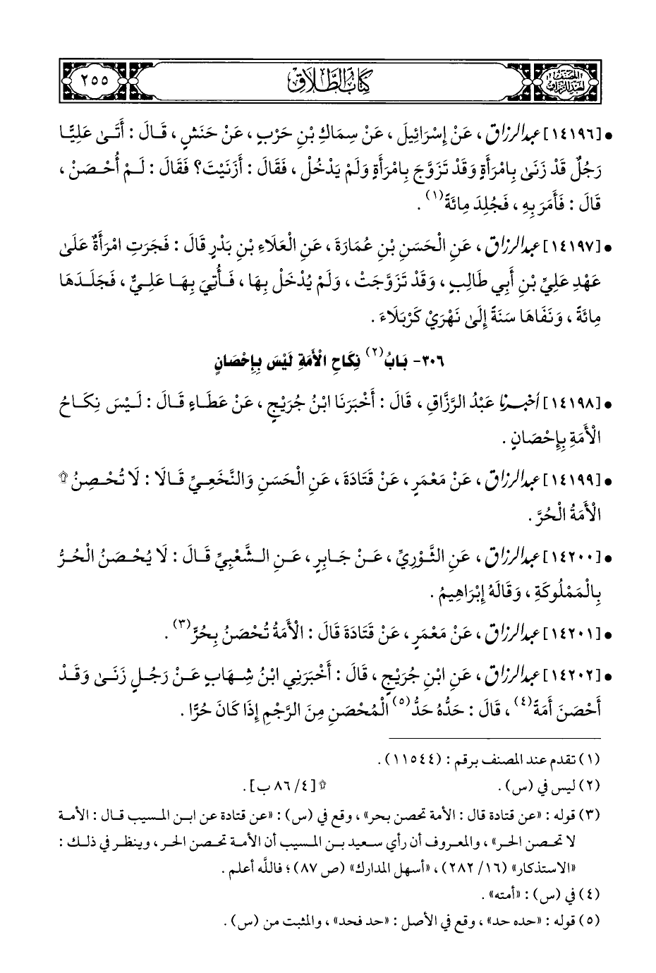 (¬٣) قوله: "عن قتادة قال: الأمة تحصن بحر"، وقع في (س): "عن قتادة عن ابن المسيب قال: الأمة لا تحصن الحر"، والمعروف أن رأي سعيد بن المسيب أن الأمة تحصن الحر، وينظر في ذلك: "الاستذكار" (١٦/ ٢٨٢)، "أسهل المدارك" (ص ٨٧)، فالله أعلم.