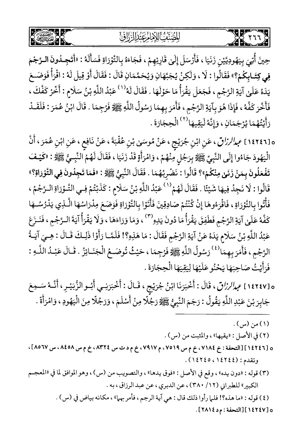 ° [١٤٢٤٧] عبد الرزاق، قَالَ: أَخْبَرَنَا ابْنُ جُرَيْجٍ، قَالَ: أَخْبَرَنِي أَبُو الزُّبَيْرِ، أَنَّهُ سَمِعَ جَابِرَ بْنَ عَبْدِ اللَّهِ يَقُولُ: رَجَمَ النَّبِيُّ - صلى الله عليه وسلم - رَجُلًا مِنْ أَسْلَمَ، وَرَجُلًا مِنَ الْيَهُودِ، وَامْرَأَةً.