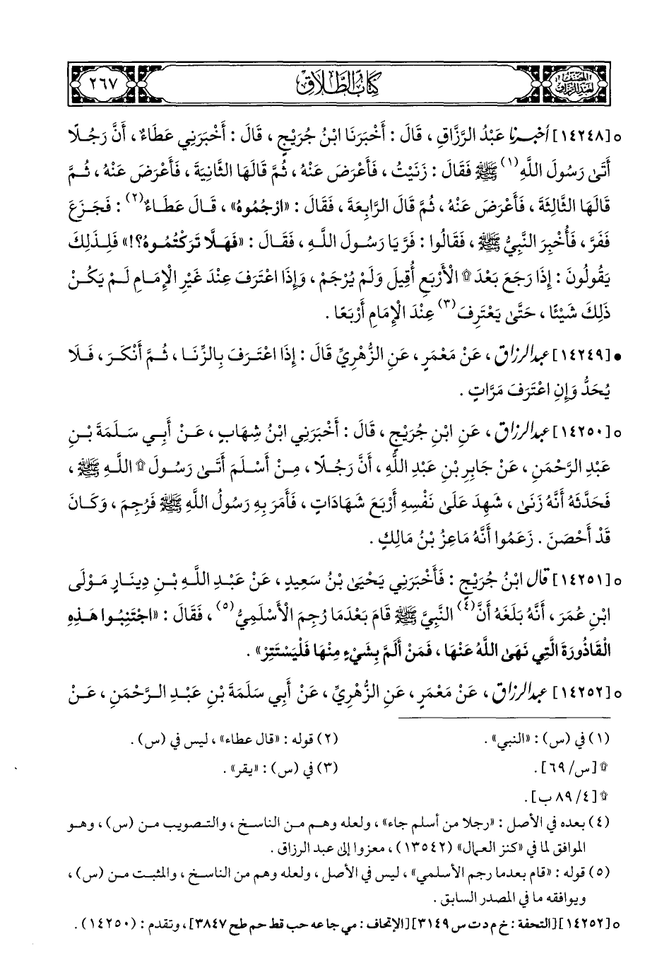 ° [١٤٢٥٠] عبد الرزاق، عَنِ ابْنِ جُرَيْجٍ، قَالَ: أَخْبَرَنِي ابْنُ شِهَابٍ، عَنْ أَبِي سَلَمَةَ بْنِ غبْدِ الرَّحْمَنِ، عَنْ جَابِرِ بْنِ عَبْدِ اللَّهِ، أَنَّ رَجُلًا، مِنْ أَسْلَمَ أَتَى رَسُولَ * اللَّهِ - صلى الله عليه وسلم -، فَحَدَّثَهُ أَنَّة زَنَى، شَهِدَ عَلَى نَفْسِهِ أَرْبَعَ شَهَادَات، فَأَمَرَ بِهِ رَسُولُ اللَّهِ - صلى الله عليه وسلم - فَرُجِمَ، وَكَانَ قَدْ أَحْصَنَ. زَعَمُوا أَنَّهُ مَاعِزُ بْنُ مَالِكٍ.