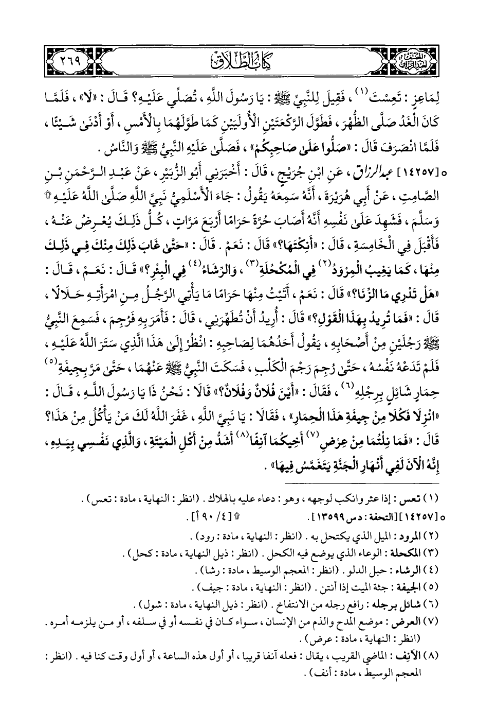 ° [١٤٢٥٧] عبد الرزاق، عَنِ ابْنِ جُرَيْجٍ، قَالَ: أَخْبَرَنِي أَبُو الزُّبَيْرِ، عَنْ عَبْدِ الرَّحْمَنِ بْنِ الصَّامِتِ، عَنْ أَبِي هُرَيْرَةَ، أَنَّهُ سَمِعَهُ يَقُولُ: جَاءَ الْأَسْلَمِيُّ نَبِيَّ اللَّهِ صَلَّى اللَّهُ عَلَيْهِ * وَسَلَّمَ، فَشَهِدَ عَلَى نَفْسِهِ أَنَّهُ أَصَابَ حُرَّةَ حَرَامًا أَرْبَعَ مَرَّاب، كُلُّ ذَلِكَ يُعْرِضُ عَنْهُ، فَأَقْبَلَ فِي الْخَامِسَةِ، قَالَ: "أَنِكْتَهَا؟ " قَالَ: نَعَمْ. قَالَ: "حَتى غَابَ ذَلِكَ مِنْكَ فِي ذَلِكَ مِنْهَا، كَمَا يَغِيبُ الْمِرْوَدُ (¬٢) فِي الْمُكْحُلَةِ (¬٣)، وَالرِّشَاءُ (¬٤) فِي الْبِئْرِ؟ " قَالَ: نَعَمْ، قَالَ: "هَلْ تَدْرِي مَا الزِّنَا؟ " قَالَ: نَعَمْ، أَتَيْتُ مِنْهَا حَرَامًا مَا يَأْتي الرَّجُلُ مِنِ امْرَأَتِهِ حَلَالًا، قَالَ: "فَمَا تُرِيدُ بِهَذَا الْقَوْلِ؟ " قَالَ: أُرِيدُ أَنْ تُطَهِّرَنِي، قَالَ: فَأَمَرَ بِهِ فَرُجِمَ، فَسَمِعَ النَّبِيُّ - صلى الله عليه وسلم - رَجُلَيْنِ مِنْ أَصْحَابِهِ، يَقُولُ أَحَدُهُمَا لِصَاحِبِهِ: انْظُرْ إِلَى هَذَا الَّذِي سَتَرَ اللَّهُ عَلَيْهِ، فَلَم تَدَعْهُ نَفْسُهُ، حَتَّى رُجِمَ رَجْمَ الْكَلْبِ، فَسَكَتَ النَّبِي - صلى الله عليه وسلم - عَنْهُمَا، حَتَّى مَرَّ بِجِيفَةِ (¬٥) حِمَارٍ شَائِلٍ بِرِجْلِهِ (¬٦)، فَقَالَ: "أَيْنَ فُلَانٌ وَفُلَان؟ " قَالَا: نَحْنُ ذَا يَا رَسُولَ اللَّهِ، قَالَ: "انْزِلَا فَكُلَا مِنْ جِيفَةِ هَذَا الْحِمَارِ"، فَقَالَا: يَا نَبِيَّ اللَّهِ، غَفَرَ اللَّهُ لَكَ مَنْ يَأْكُلُ مِنْ هَذَا؟ قَالَ: "فَمَا نِلْتُمَا مِنْ عِرْضِ (¬٧) أَخِيكُمَا آنِفًا (¬٨) أَشَدُّ مِنْ اكلِ الْمَيْتَةِ، وَالَّذِي نَفْسِي بِيَدِهِ، إِنَّهُ الْآنَ لَفِي أَنْهَارِ الْجَنَّةِ يَتَغَمَّسُ فِيهَا".