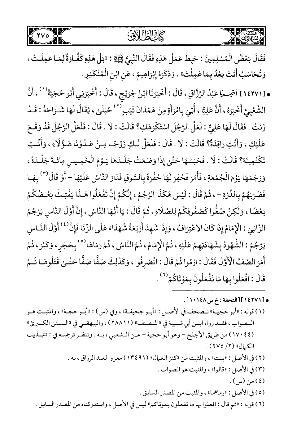 • [١٤٢٧١] أخبرنا عَبْدُ الرَّزَّاقِ، قَالَ: أَخْبَرَنَا ابْنُ جُرَيْجٍ، قَالَ: أَخْبَرَنِي أَبُو حُجَيَّةَ (¬١)، أَنَّ الشَّعْبِيَّ أَخْبَرَهُ، أَنَّ عَلِيًّا، أُتِيَ بِامْرَأَةٍ مِنْ هَمْدَانَ ثَيِّبٍ (¬٢) حُبْلَى، يُقَالُ لَهَا شَرَاحَةُ: قَدْ زَنَتْ. فَقَالَ لَهَا عَلِيٌّ: لَعَلَّ الرَّجُلَ اسْتَكْرَهَكِ؟ قَالَتْ: لَا. قَالَ: فَلَعَلَّ الرَّجُلَ قَدْ وَقَعَ عَلَيْكِ، وَأَنْتِ رَاقِدَةٌ؟ قَالَتْ: لَا. قَالَ: فَلَعَلَّ لَكِ زَوْجًا مِنْ عَدُوِّنَا هَؤُلَاءِ، وَأَنْتِ تَكْتُمِينَهُ؟ قَالَتْ: لَا. فَحَبَسَهَا حَتَّى إِذَا وَضَعَتْ جَلَدَهَا يَوْمَ الْخَمِيسِ مِائَةَ جَلْدَةً، وَرَجَمَهَا يَوْمَ الْجُمُعَةِ، فَأَمَرَ فَحُفِرَ لَهَا حُفْرَة بِالسُّوقِ فَدَارَ النَّاسُ عَلَيْهَا - أَوْ قَالَ (¬٣) بِهَا فَضَرَبَهُمْ بِالدِّرَّةِ -، ثُمَّ قَالَ: لَيْسَ هَكَذَا الرَّجْمُ، إِنَّكُمْ إِنْ تَفْعَلُوا هَذَا يَفْتِكْ بَعْضُكُمْ بَعْضًا، وَلكِنْ صُفُّوا كَصُفُوفِكُمْ لِلصَّلَاةِ، ثُمَّ قَالَ: يَا أَيُّهَا النَّاسُ، إِنَّ أَوَّلَ النَّاسِ يَرْجُمُ الزَّانِيَ: الْإِمَامُ إِذَا كَانَ الاِعْتِرَافُ، وإِذَا شَهِدَ أَرْبَعَةُ شُهَدَاءَ عَلَى الزِّنَا فَإِنَّ (¬٤) أَوَّلَ النَّاسِ يَرْجُمُ: الشُّهُودُ بِشَهَادَتِهِمْ عَلَيْهِ، ثُمَّ الْإِمَامُ، ثُمَّ النَّاسُ، ثُمَّ رَمَاهَا (¬٥) بِحَجَرٍ، وَكَبَّرَ، ثُمَّ أَمَرَ الصَّفَّ الْأَوَّلَ فَقَالَ: ارْمُوا ثُمَّ قَالَ: انْصَرِفُوا، وَكَذَلِكَ صَفًّا صَفًّا حَتَّى قَتَلُوهَا ثُمَّ قَالَ: افْعَلُوا بِهَا مَا تَفْعَلُونَ بِمَوْتَاكُمْ (¬٦).