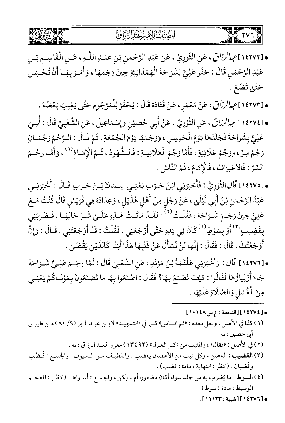 • [١٤٢٧٤] عبد الرزاق، عَنِ الثَّوْرِيِّ، عَنْ أَبِي حُصيْنٍ وإسْمَاعِيلَ، عَنِ الشَّعْبِيِّ قَالَ: أُتِيَ عَلِيٌّ بِشَرَاحَةَ فَجَلَدَهَا يَوْمَ الْخَمِيسِ، وَرَجَمَهَا يَوْمَ الْجُمُعَةِ، ثُمَّ قَالَ: الرَّجْمُ رَجْمَانِ رَجْمُ سرٍّ، وَرَجْمُ عَلَانِيَةٍ، فَأَمَّا رَجْمُ الْعَلَانِيَةِ: فَالشُّهُودُ، ثُمَّ الْإِمَامُ (¬١)، وَأَمَّا رَجْمُ السِّرِّ: فَالاِعْتِرَافُ، فَالْإِمَامُ، ثُمَّ النَّاسُ.
