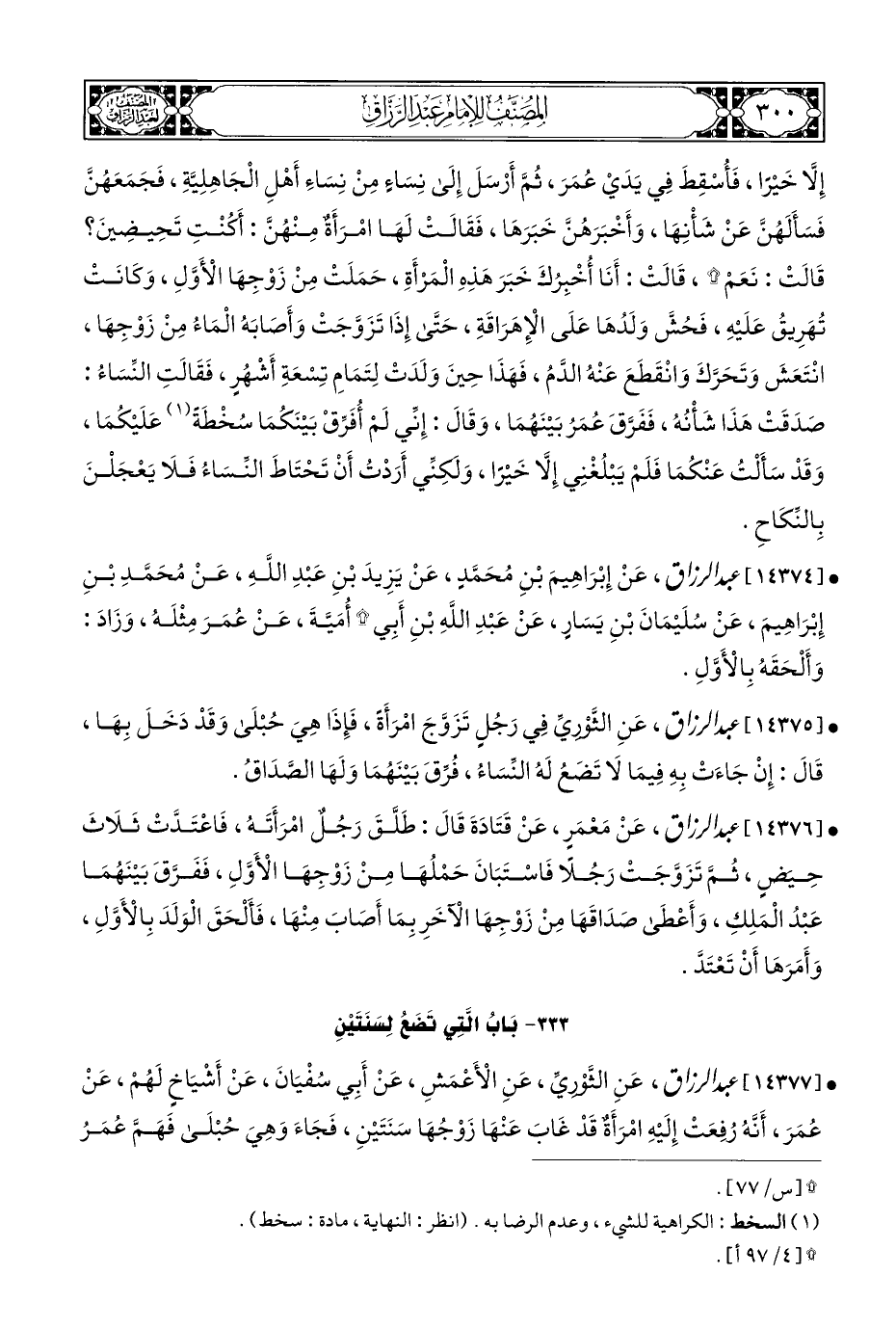 إِلَّا خَيْرًا، فَأُسْقِطَ فِي يَدَيْ عُمَرَ، ثُمَّ أَرْسَلَ إِلَى نِسَاءِ مِنْ نِسَاءِ أَهْلِ الْجَاهِلِيَّةِ، فَجَمَعَهُنَّ فَسَأَلَهُنَّ عَنْ شَأْنِهَا، وَأَخْبَرَهُنَّ خَبَرَهَا، فَقَالَتْ لَهَا امْرَأَةٌ مِنْهُنَّ: أَكُنْتِ تَحِيضينَ؟ قَالَتْ: نَعَمْ *، قَالَتْ: أَنَا أُخْبِرُكَ خَبَرَ هَذِهِ الْمَرْأَةِ، حَمَلَتْ مِنْ زَوْجِهَا الْأَوَّلِ، وَكَانَتْ تُهَرِيقُ عَلَيْهِ، فَحُشَّ وَلَدُهَا عَلَى الْإِهَرَاقَةِ، حَتَّى إِذَا تَزَوَّجَتْ وَأَصَابَهُ الْمَاءُ مِنْ زَوْجِهَا، انْتَعَشَ وَتَحَرَّكَ وَانْقَطَعَ عَنْهُ الدَّمُ، فَهَذَا حِينَ وَلَدَتْ لِتَمَامِ تِسْعَةِ أَشْهُرٍ، فَقَالَتِ النِّسَاءُ: صَدَقَتْ هَذَا شَأْنُهُ، فَفَرَّقَ عُمَرُ بَيْنَهُمَا، وَقَالَ: إِنِّي لَمْ أُفَرِّقْ بَيْنَكُمَا سُخْطَةً (¬١) عَلَيْكُمَا، وَقَدْ سَأَلْتُ عَنْكُمَا فَلَمْ يَبْلُغْنِي إِلَّا خَيْرًا، وَلكنِّي أَرَدْتُ أَنْ تَحْتَاطَ النِّسَاءُ فَلَا يَعْجَلْنَ بِالنِّكَاحِ.