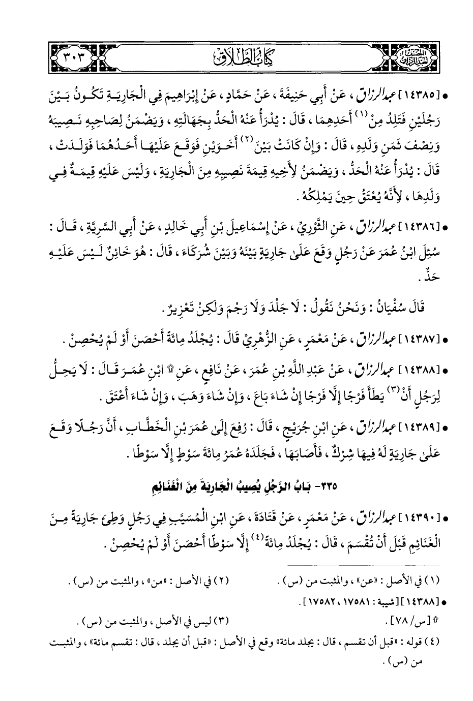 • [١٤٣٩٠] عبد الرزاق، عَنْ مَعْمَرٍ، عَنْ قَتَادَةَ، عَنِ ابْنِ الْمُسَيَّبِ فِي رَجُلٍ وَطِئَ جَارِيَةً مِنَ الْغَنَائِمِ قَبْلَ أَنْ تُقْسَمَ، قَالَ: يُجْلَدُ مِائَةً (¬٤) إِلَّا سَوْطًا أَحْصَنَ أَوْ لَمْ يُحْصِنْ.