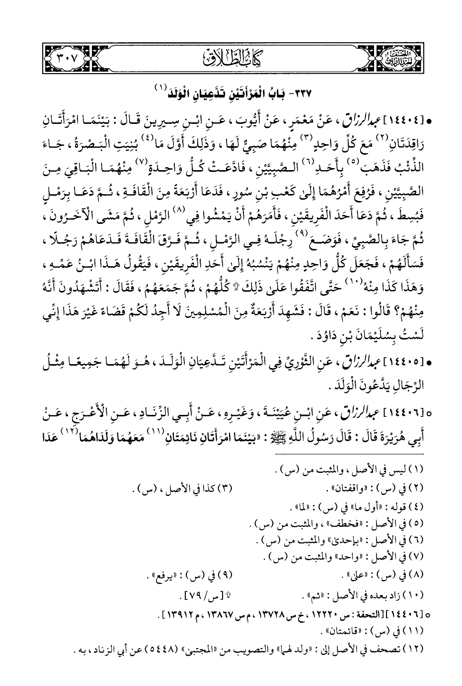 • [١٤٤٠٤] عبد الرزاق، عَنْ مَعْمَرٍ، عَنْ أَيُّوبَ، عَنِ ابْنِ سِيرِينَ قَالَ: بَيْنَمَا امْرَأَتَانِ رَاقِدَتَانِ (¬٢) مَعَ كُلِّ وَاحِدٍ (¬٣) مِنْهُمَا صَبِيٌّ لَهَا، وَذَلِكَ أَوَّلَ مَا (¬٤) بُنِيَتِ الْبَصرَةُ، جَاءَ الذِّئْبُ فَذَهَبَ (¬٥) بِأَحَدِ (¬٦) الصَّبِييْنِ، فَادَّعَتْ كُلُّ وَاحِدَةٍ (¬٧) مِنْهُمَا الْبَاقِيَ مِنَ الصبِيَّيْنِ، فَرُفِعَ أَمْرُهُمَا إِلَى كَعْبِ بْنِ سُورٍ، فَدَعَا أَرْبَعَةً مِنَ الْقَافَةِ، ثُمَّ دَعَا بِرَمْلٍ فَبُسِطَ، ثُمَّ دَعَا أَحَدَ الْفَرِيقَيْنِ، فَأَمَرَهُمْ أَنْ يَمْشُوا فِي (¬٨) الرَّمْلِ، ثُمَّ مَشَى الْآخَرُونَ، ثُمَّ جَاءَ بِالصَّبِيِّ، فَوَضَعَ (¬٩) رِجْلَهُ فِي الرَّمْلِ، ثُمَّ فَرَّقَ الْقَافَةَ فَدَعَاهُمْ رَجُلًا، فَسَأَلَهُمْ، فَجَعَلَ كُلُّ وَاحِدٍ مِنْهُمْ يَنْسُبُهُ إِلَى أَحَدِ الْفَرِيقَيْنِ، فَيَقُولُ هَذَا ابْنُ عَمِّهِ، وَهَذَا كَذَا مِنْهُ (¬١٠) حَتَّى اتَّفَقُوا عَلَى ذَلِكَ * كُلُّهُمْ، ثمَّ جَمَعَهُمُ، فَقَالَ: أَتَشْهَدُونَ أَنَّهُ مِنْهُمْ؟ قَالُوا: نَعَمْ، قَالَ: فَشَهِدَ أَرْبَعَةٌ مِنَ الْمُسْلِمِينَ لَا أَجِدُ لَكُمْ قَضَاءً غَيْرَ هَذَا إِنِّي لَسْتُ بِسُلَيْمَانَ بْنِ دَاوُدَ.