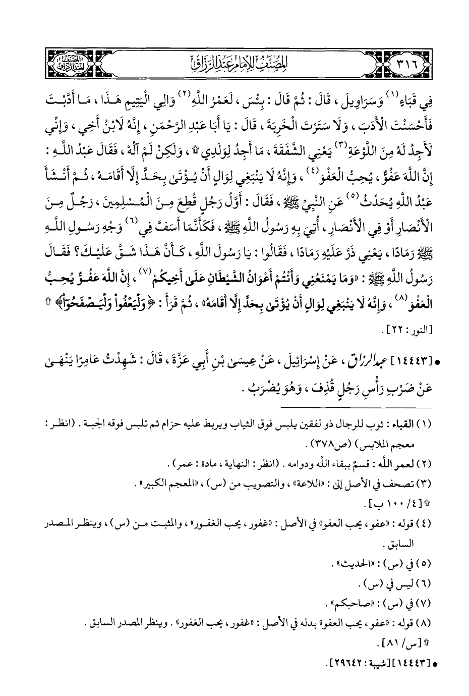 (¬٤) قوله: "عفو، يحب العفو "في الأصل: "غفور، يحب الغفور"، والمثبت من (س)، وينظر المصدر السابق.