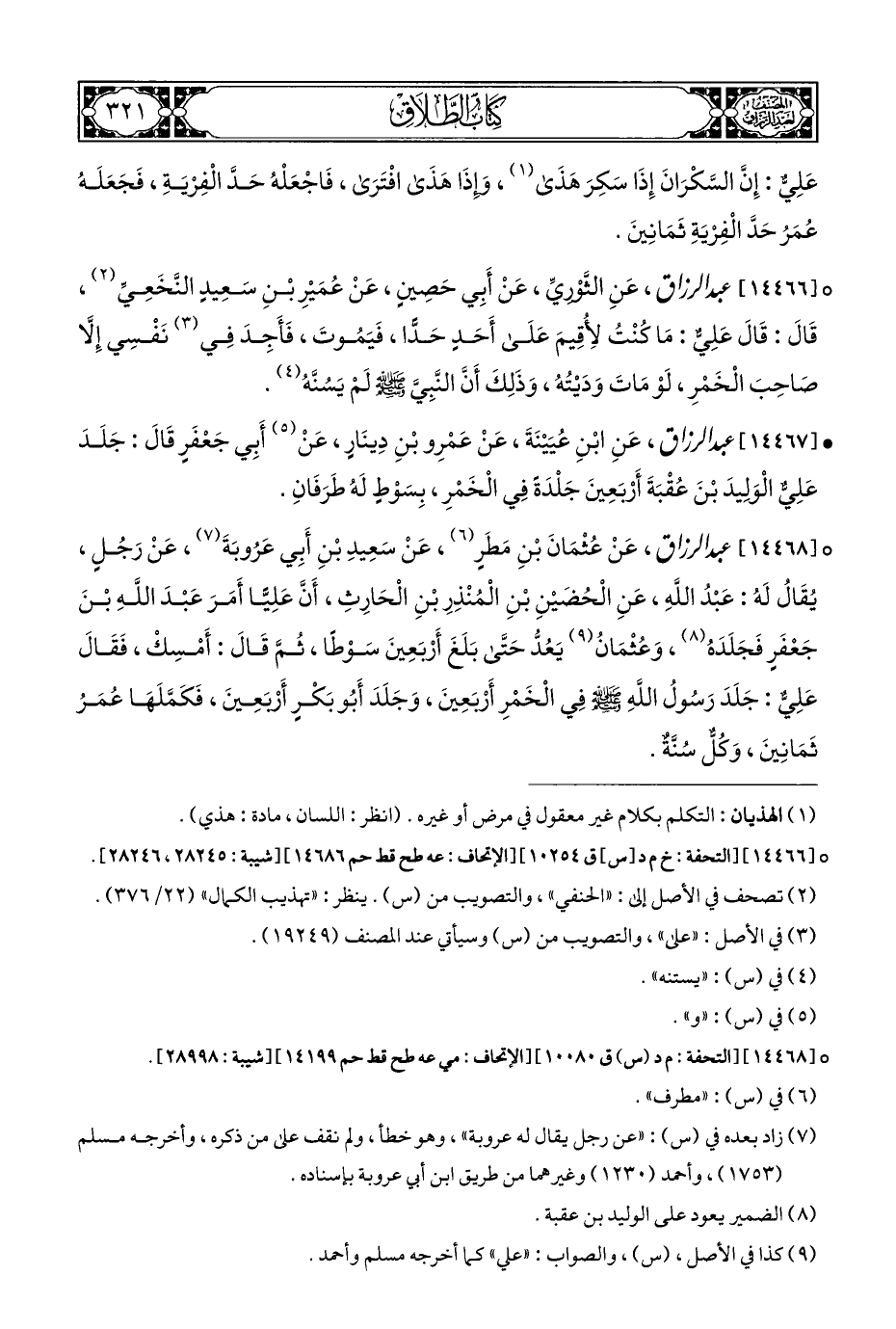 ° [١٤٤٦٨] عبد الرزاق، عَنْ عُثْمَانَ بْنِ مَطَرٍ (¬٦)، عَنْ سَعِيدِ بْنِ أَبِي عَرُوبَةَ (¬٧)، عَنْ رَجُلٍ، يُقَالُ لَهُ: عَبْدُ اللَّهِ، عَنِ الْحُضَيْنِ بْنِ الْمُنْذِرِ بْنِ الْحَارِثِ، أَنَّ عَلِيًّا أَمَرَ عَبْدَ اللَّهِ بْنَ جَعْفَرِ فَجَلَدَهُ (¬٨)، وَعُثْمَانُ (¬٩) يَعُدُّ حَتَّى بَلَغَ أَرْبَعِينَ سَوْطًا، ثُمَّ قَالَ: أَمْسِكْ، فَقَالَ عَلِيٌّ: جَلَدَ رَسُولُ اللَّهِ - صلى الله عليه وسلم - فِي الْخَمْرِ أَرْبَعِينَ، وَجَلَدَ أَبُو بَكْرٍ أَرْيَعِينَ، فَكَمَّلَهَا عُمَرُ ثَمَانِينَ، وَكُلٌّ سُنَّة.