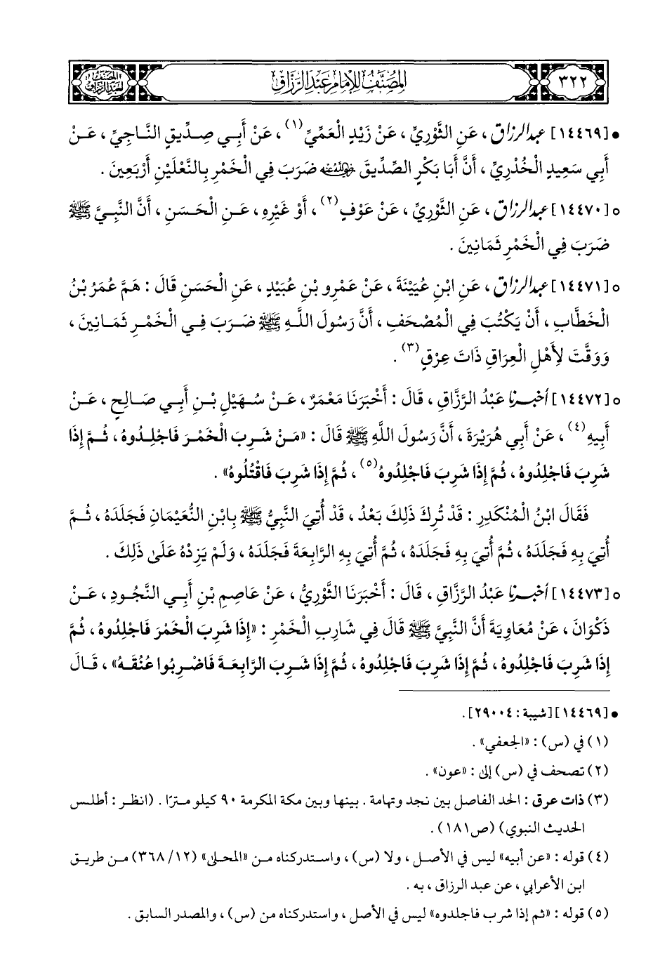 • [١٤٤٦٩] عبد الرزاق، عَنِ الثوْرِيِّ، عَنْ زَيْدٍ الْعَمّيِّ (¬١)، عَنْ أَبِي صِدِّيقٍ النَّاجِيِّ، عَنْ أَبِي سَعِيدٍ الْخُدْرِيِّ، أَنَّ أَبَا بَكْرٍ الصِّدِّيقَ - رضي الله عنه - ضَرَبَ فِي الْخَمْرِ بِالنَّعْلَيْنِ أَرْبَعِينَ.