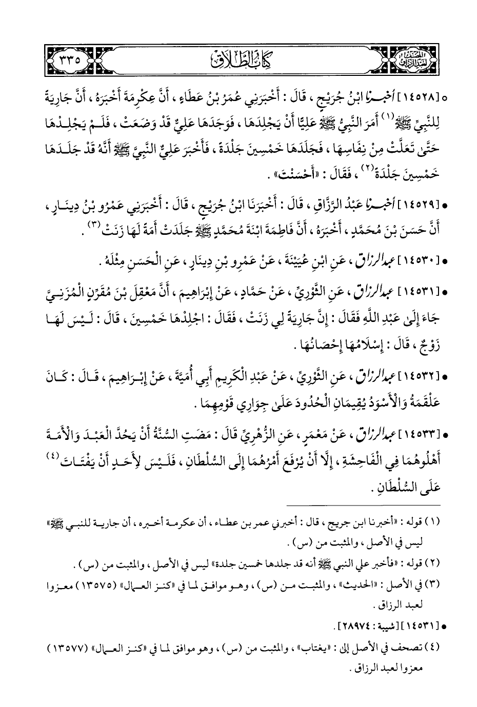 • [١٤٥٣٣] عبد الرزاق، عَنْ مَعْمَرٍ، عَنِ الزُّهْرِيِّ قَالَ: مَضَتِ السُّنَّةُ أَنْ يَحُدَّ الْعَبْدَ وَالْأَمَةَ أَهْلُوهُمَا فِي الْفَاحِشَةِ، إِلَّا أَنْ يُرْفَعَ أَمْرُهُمَا إِلَى السُّلْطَانِ، فَلَيْسَ لِأَحَدٍ أَنْ يَفْتَاتَ (¬٤) عَلَى السُّلْطَانِ.