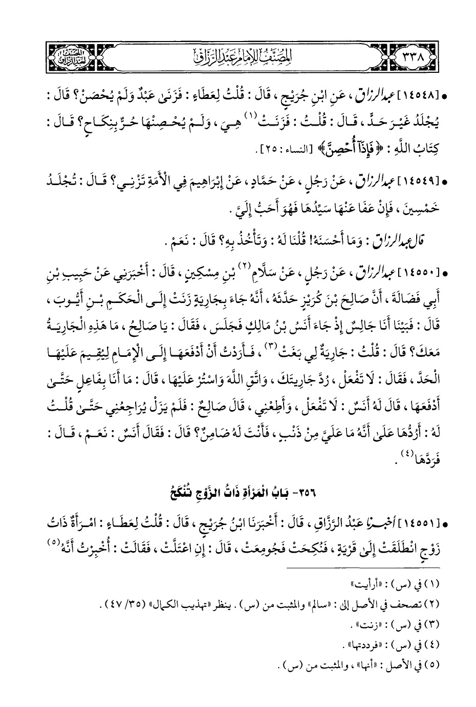• [١٤٥٥٠] عبد الرزاق، عَنْ رَجُلٍ، عَنْ سَلَّامِ (¬٢) بْنِ مِسْكِينٍ، قَالَ: أَخْبَرَنِي عَنْ حَبِيبِ بْنِ أَبِي فَضَالَةَ، أَنَّ صَالِحَ بْنَ كُرَيْزٍ حَدَّثَهُ، أَنَّهُ جَاءَ بِجَارِيَةٍ زَنَتْ إِلَى الْحَكَمِ بْنِ أَيُّوبَ، قَالَ: فَبَيْنَا أَنَا جَالِسٌ إِذْ جَاءَ أَنَسُ بْنُ مَالِكٍ فَجَلَسَ، فَقَالَ: يَا صَالِحُ، مَا هَذِهِ الْجَارِيَةُ مَعَكَ؟ قَالَ: قُلْتُ: جَارِيَةٌ لِي بَغَتْ (¬٣)، فَأَرَدْتُ أَنْ أَدْفَعَهَا إِلَى الْإِمَامِ لِيقِيمَ عَلَيْهَا الْحَدَّ، فَقَالَ: لَا تَفْعَلْ، رُدَّ جَارِيتَكَ، وَاتَّقِ اللَّهَ وَاسْتُرْ عَلَيْهَا، قَالَ: مَا أَنَا بِفَاعِلٍ حَتَّى أَدْفَعَهَا، قَالَ لَهُ أَنَسٌ: لَا تَفْعَلْ، وَأَطِعْنِي، قَالَ صَالِحٌ: فَلَمْ يَزَلْ يُرَاجِعُنِي حَتَّى قُلْتُ لَهُ: أَرُدُّهَا عَلَى أَنَّهُ مَا عَلَيَّ مِنْ ذَنْبٍ، فَأَنْتَ لَهُ ضَامِنٌ؟ قَالَ: فَقَالَ أَنَسٌ: نَعَمْ، قَالَ: فَرَدَّهَا (¬٤).
