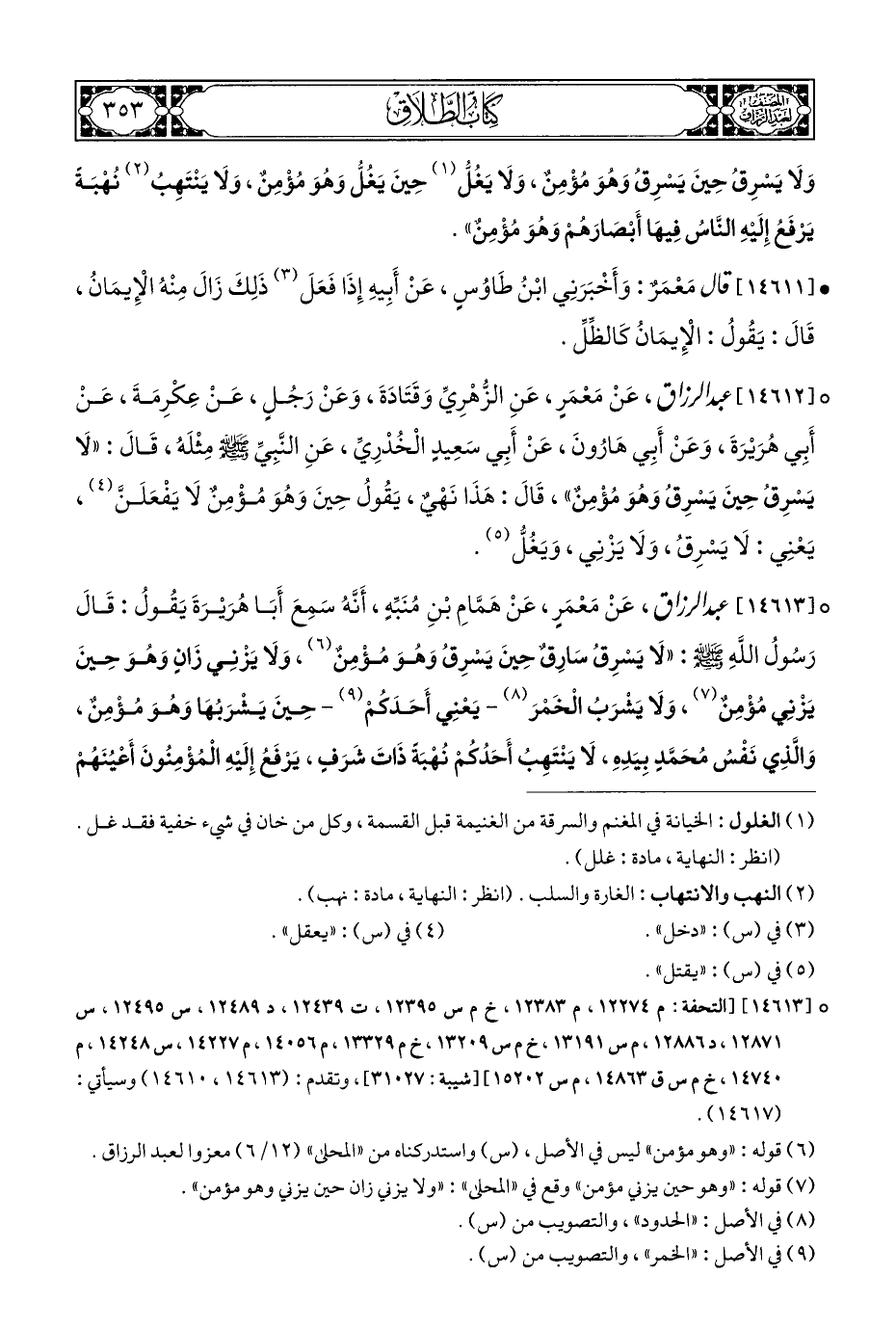 ° [١٤٦١٢] عبد الرزاق، عَنْ مَعْمَرٍ، عَنِ الزُّهْرِيِّ وَقَتَادَةَ، وَعَنْ رَجُلٍ، عَنْ عَكْرِمَةَ، عَنْ أَبِي هُرَيْرَةَ، وَعَنْ أَبِي هَارُونَ، عَنْ أَبِي سَعِيدٍ الْخُدْرِيِّ، عَنِ النَّبِيِّ - صلى الله عليه وسلم - مِثْلَهُ، قَالَ: "لَا يَسْرِقُ حِينَ يَسْرِقُ وَهُوَ مُؤْمِنٌ"، قَالَ: هَذَا نَهْيٌ، يَقُولُ حِينَ وَهُوَ مُؤْمِنٌ لَا يَفْعَلَنَّ (¬٤)، يَعْنِي: لَا يَسْرِقُ، وَلَا يَزْنِي، وَيَغُلُّ (¬٥).