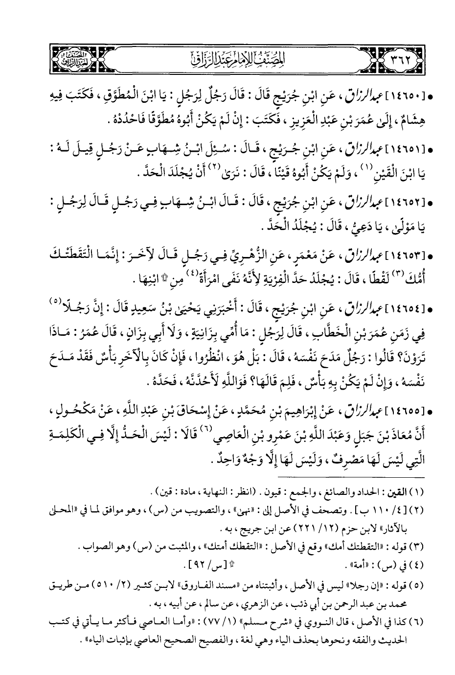 • [١٤٦٥٢] عبد الرزاق، عَنِ ابْنِ جُرَيْجٍ، قَالَ: سُئِلَ ابْنُ شِهَابٍ عَنْ رَجُلٍ قِيلَ لَهُ: يَا ابْنَ الْقَيْنِ (¬١)، وَلَمْ يَكُنْ أَبُوهُ قَيْنًا، قَالَ: نَرَى (¬٢) أَنْ يُجْلَدَ الْحَدَّ.