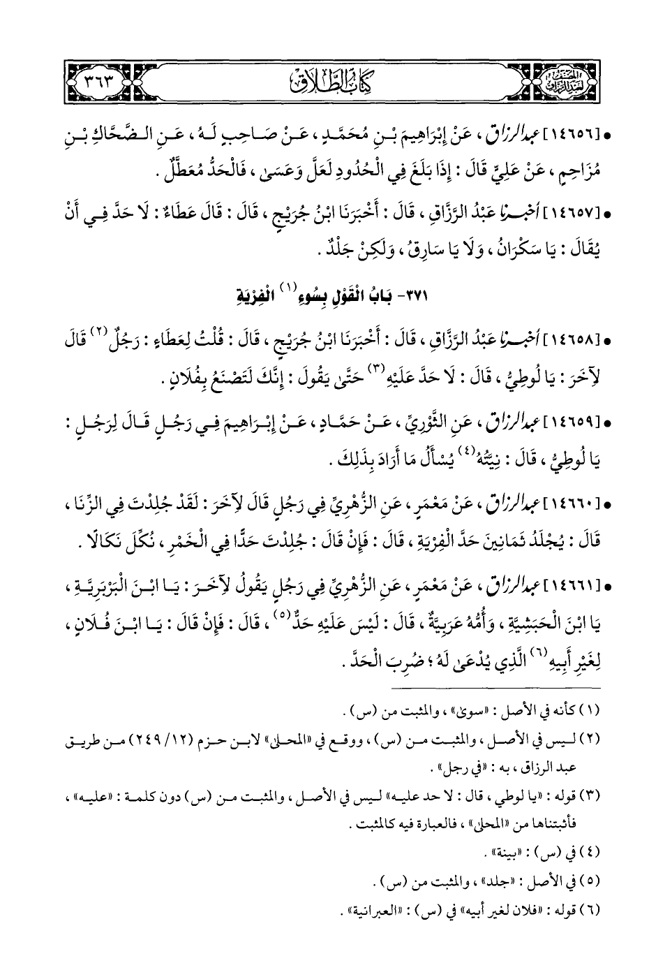 (¬٣) قوله: "يا لوطي، قال: لا حد عليه" ليس في الأصل، والمثبت من (س) دون كلمة: "عليه"، فأثبتناها من "المحلى"، فالعبارة فيه كالمثبت.