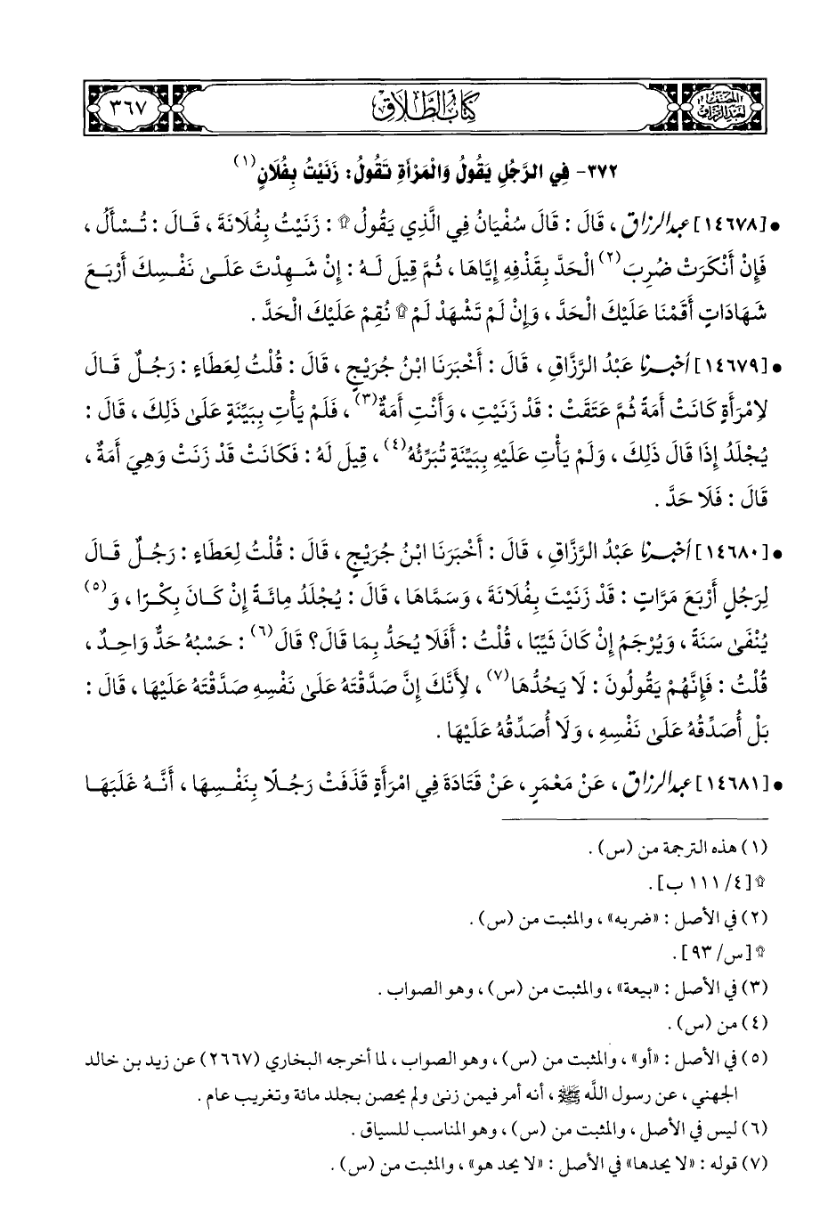 • [١٤٦٧٩] أخبرنا عَبْدُ الرَّزَّاقِ، قَالَ: أَخْبَرَنَا ابْنُ جُرَيْجٍ، قَالَ: قُلْتُ لِعَطَاءٍ: رَجُلٌ قَالَ لاِمْرَأَةٍ كَانَتْ أَمَةً ثُمَّ عَتَقَتْ: قَدْ زَنَيْتِ، وَأَنْتِ أَمَةٌ (¬٣)، فَلَمْ يَأْتِ بِبَيِّنَةٍ عَلَى ذَلِكَ، قَال: يُجْلَدُ إِذَا قَالَ ذَلِكَ، وَلَمْ يَأْتِ عَلَيْهِ بِبَيِّنَةٍ تُبَرِّئُهُ (¬٤)، قِيلَ لَهُ: فَكَانَتْ قَدْ زَنَتْ وَهِيَ أَمَةٌ، قَالَ: فَلَا حَدَّ.