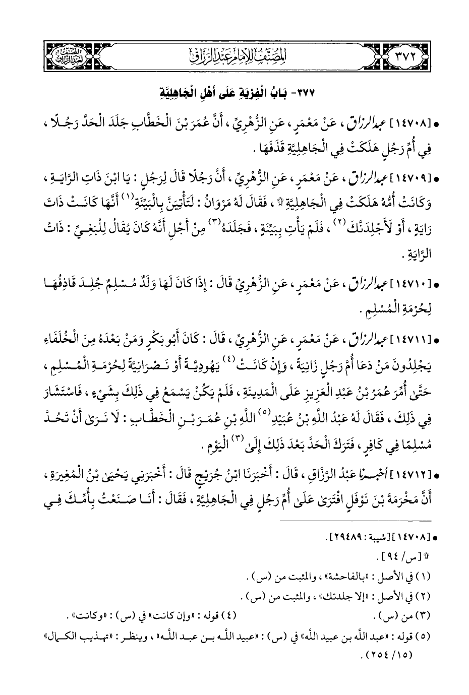 • [١٤٧١٢] أخبرنا عَبْدُ الرَّزَّاقِ، قَالَ: أَخْبَرَنَا ابْنُ جُرَيْجٍ قَالَ: أَخْبَرَنِي يَحْيَى بْنُ الْمُغِيرَةِ، أَنَّ مَخْرَمَةَ بْنَ نَوْفَلٍ افْتَرَى عَلَى أُمِّ رَجُلٍ فِي الْجَاهِلِيَّةِ، فَقَالَ: أَنَا صَنَعْتُ بِأُمِّكَ فِي