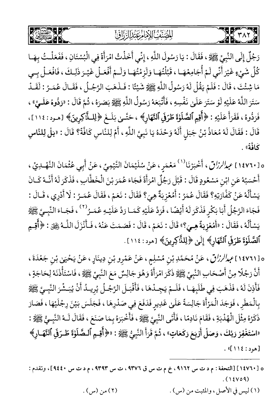 ° [١٤٧٦١] عبد الرزاق، عَنْ مُحَمَّدِ بْنِ مُسْلِمٍ، عَنْ عَمْرِو بْنِ دِينَارٍ، عَنْ يَحْيَى بْنِ جَعْدَةَ، أَنَّ رَجُلًا مِنْ أَصحَابِ النَّبِيِّ - صلى الله عليه وسلم - ذَكَرَ امْرَأَةً وَهُوَ جَالِسٌ مَعَ النَّبِيِّ - صلى الله عليه وسلم -، فَاسْتَأْذَنَهُ لِحَاجَةٍ، فَأَذِنَ لَهُ، فذَهَبَ فِي طَلَبِهَا، فَلَمْ يَجِدْهَا، فَأَقْبَلَ الرَّجُلُ يُرِيدُ أَنْ يُبَشِّرَ النَّبِيَّ - صلى الله عليه وسلم - بِالْمَطَرِ، فَوَجَدَ الْمَرْأَةَ جَالِسَةً عَلَى غَدِيرٍ فَدَفَعَ فِي صدْرِهَا، فَجَلَسَ بَيْنَ رِجْلَيْهَا، فَصَارَ ذَكَرُهُ مِثْلَ الْهُدْبَةِ، فَقَامَ نَادِمًا، فَأَتَى النَّبِيَّ - صلى الله عليه وسلم -، فَأَخْبَرَهُ بِمَا صَنَعَ، فَقَالَ لَهُ النَّبِيُّ - صلى الله عليه وسلم -: "اسْتَغْفِرْ رَبَّكَ، وَصَلِّ أَرْبعَ رَكَعَاتٍ"، ثُمَّ قَرَأَ النَّبِيُّ - صلى الله عليه وسلم -: " {وَأَقِمِ الصَّلَاةَ طَرَفَيِ النَّهَار} [هود:١١٤] ".
