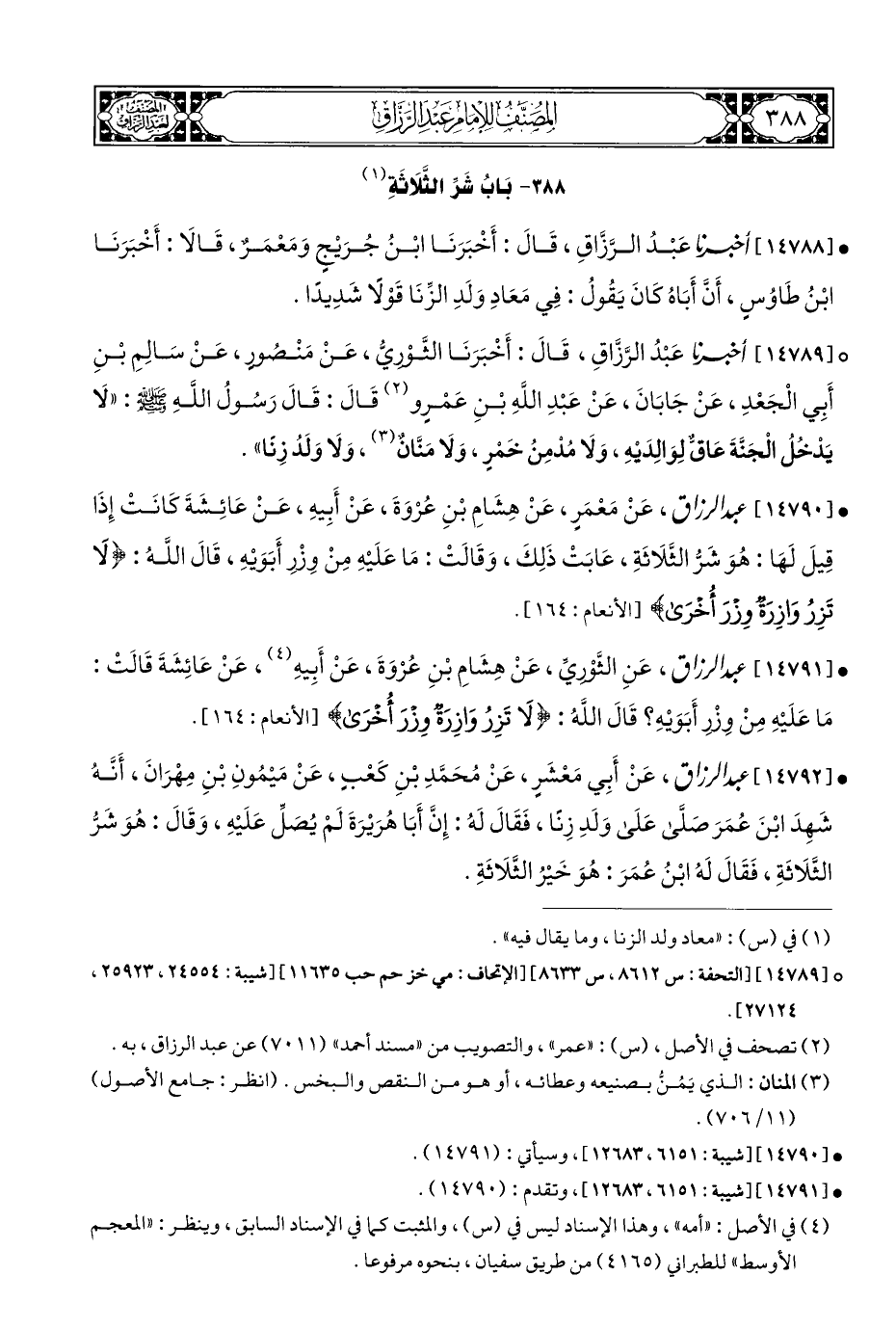 ° [١٤٧٨٩] أخبرنا عبد الرَّزَّاقِ، قَالَ: أَخْبَرَنَا الثَّوْريُّ، عَنْ مَنْصُورٍ، عَنْ سَالِمِ بْنِ أَبِي الْجَعْدِ، عَنْ جَابَانَ، عَنْ عَبْدِ اللَّهِ بْنِ عَمْرٍو (¬٢) قَالَ: قَالَ رَسُولُ اللَّهِ - صلى الله عليه وسلم -: "لَا يَدْخُلُ الْجَنَّةَ عَاقٌّ لِوَالِدَيْهِ، وَلَا مُدْمِنُ خَمْرٍ، وَلَا مَنَّانٌ (¬٣)، وَلَا وَلَدُ زِنًا".