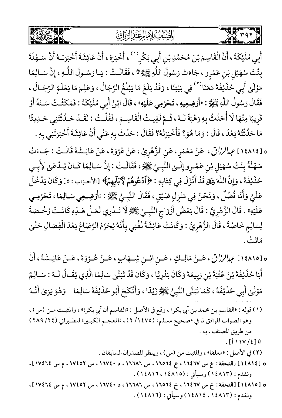 ° [١٤٨١٥] عبد الرزاق، عَنْ مَالِكٍ، عَنِ ابْنِ شِهَابٍ، عَنْ عُرْوَةَ، عَنْ عَائِشَةَ، أَنَّ أَبَا حُذَيْفَةَ بْنَ عُتْبَةَ بْنِ رَبِيعَةَ وَكَانَ بَدْرِيًّا، وَكَانَ قَدْ تَبَنَّى سَالِمًا الَّذِي يُقَالُ لَهُ: سَالِمٌ مَوْلَى أَبِي حُذَيْفَةَ، كَمَا تَبَنَّى النَّبِيُّ - صلى الله عليه وسلم - زَيْدًا، وَأَنْكَحَ أَبُو حُذَيْفَةَ سَالِمًا - وَهُوَ يَرَى أَنَّهُ