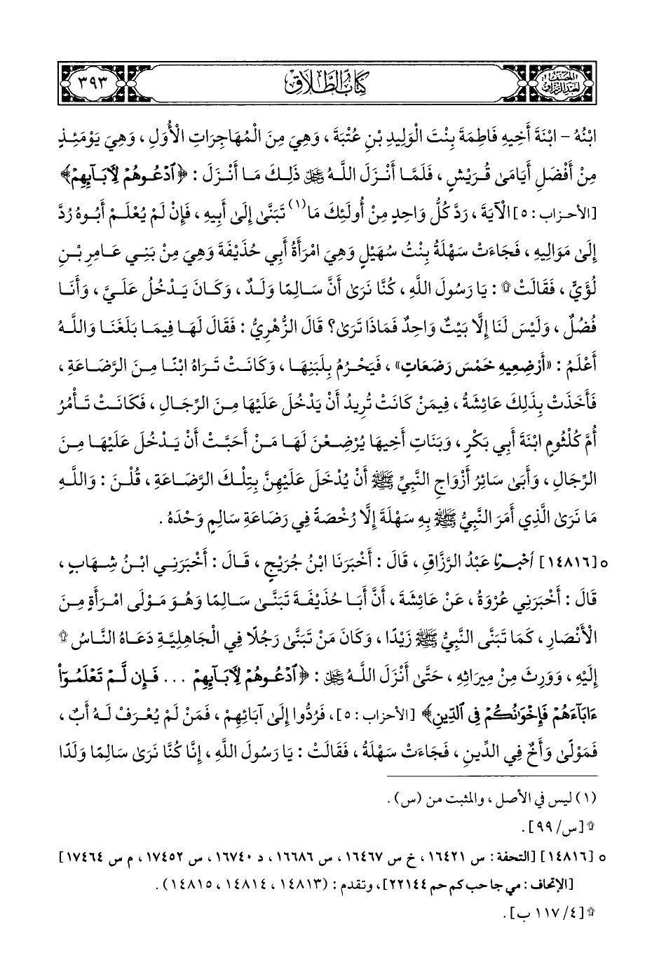 ° [١٤٨١٦] أخبرنا عَبْدُ الرَّزَّاقِ، قَالَ: أَخْبَرَنَا ابْنُ جُرَيْجٍ، قَالَ: أَخْبَرَنِي ابْنُ شِهَابٍ، قَالَ: أَخْبَرَنِي عُرْوَةُ، عَنْ عَائِشَةَ، أَنَّ أَبَا حُذَيْفَةَ تَبَنَّى سَالِمًا وَهُوَ مَوْلَى امْرَأَةٍ مِنَ الْأَنْصَارِ، كَمَا تَبَنَّى النَّبِيُّ - صلى الله عليه وسلم - زيدًا، وَكَانَ مَنْ تَبَنَّى رَجُلًا فِي الْجَاهِلِيَّةِ دَعَاهُ النَّاسُ * إِلَيْهِ، وَوَرِثَ مِنْ مِيرَاثِهِ، حَتَّى أَنْزَلَ اللَّهُ عزَّ وجلَّ: {ادْعُوهُمْ لِآبَائِهِمْ ... فَإِنْ لَمْ تَعْلَمُوا آبَاءَهُمْ فَإِخْوَانُكُمْ فِي الدِّينِ} [الأحزاب: ٥]، فَرُدُّوا إِلَى آبَائِهِمْ، فَمَنْ لَمْ يُعْرَفْ لَهُ أَبٌ، فَمَوْلًى وَأَخٌ فِي الدِّينِ، فَجَاءَتْ سَهْلَةُ، فَقَالَتْ: يَا رَسُولَ اللَّهِ، إِنَّا كُنَّا نَرَى سَالِمًا وَلَدًا