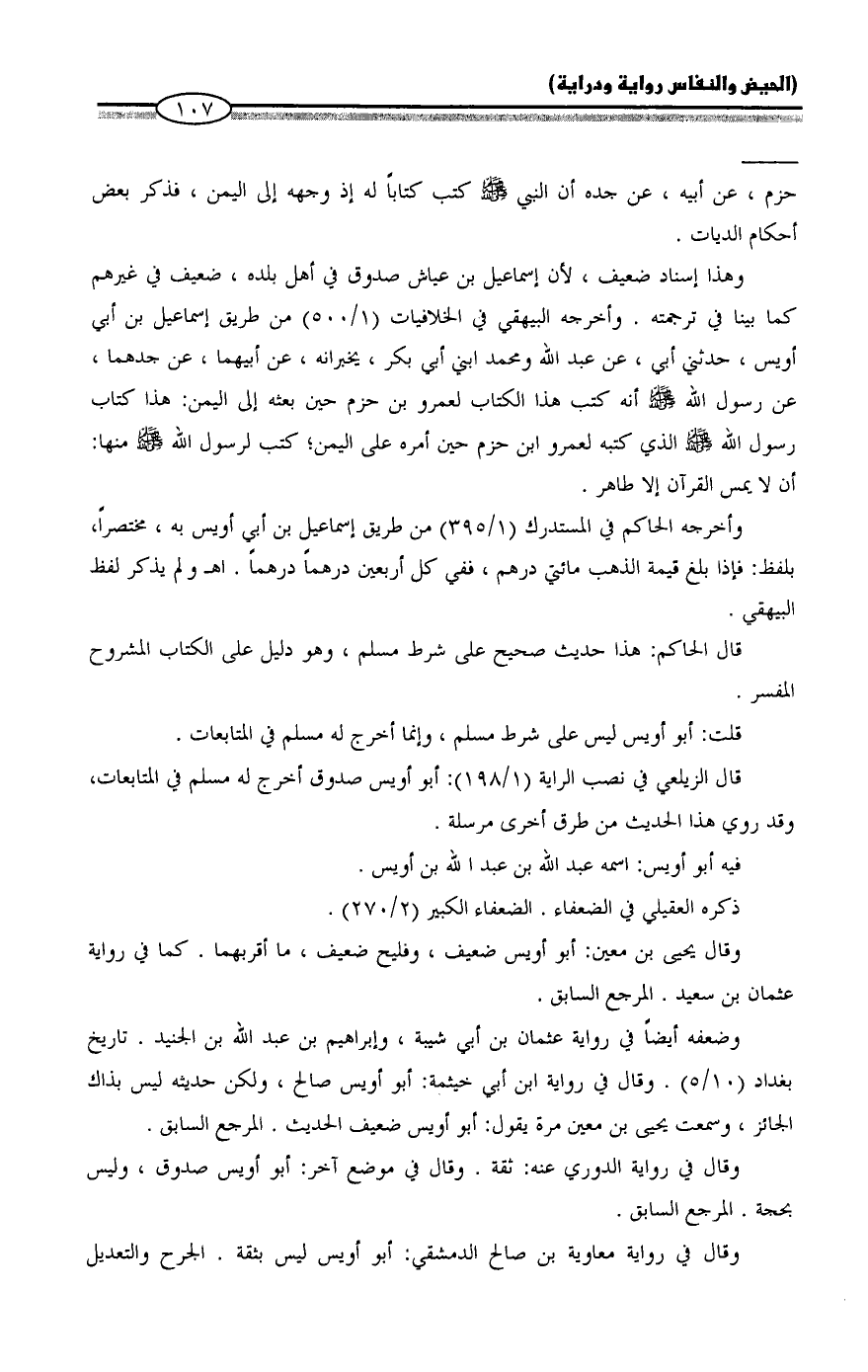 وقال في رواية معاوية بن صالح الدمشقي: أبو أويس ليس بثقة. الجرح والتعديل
