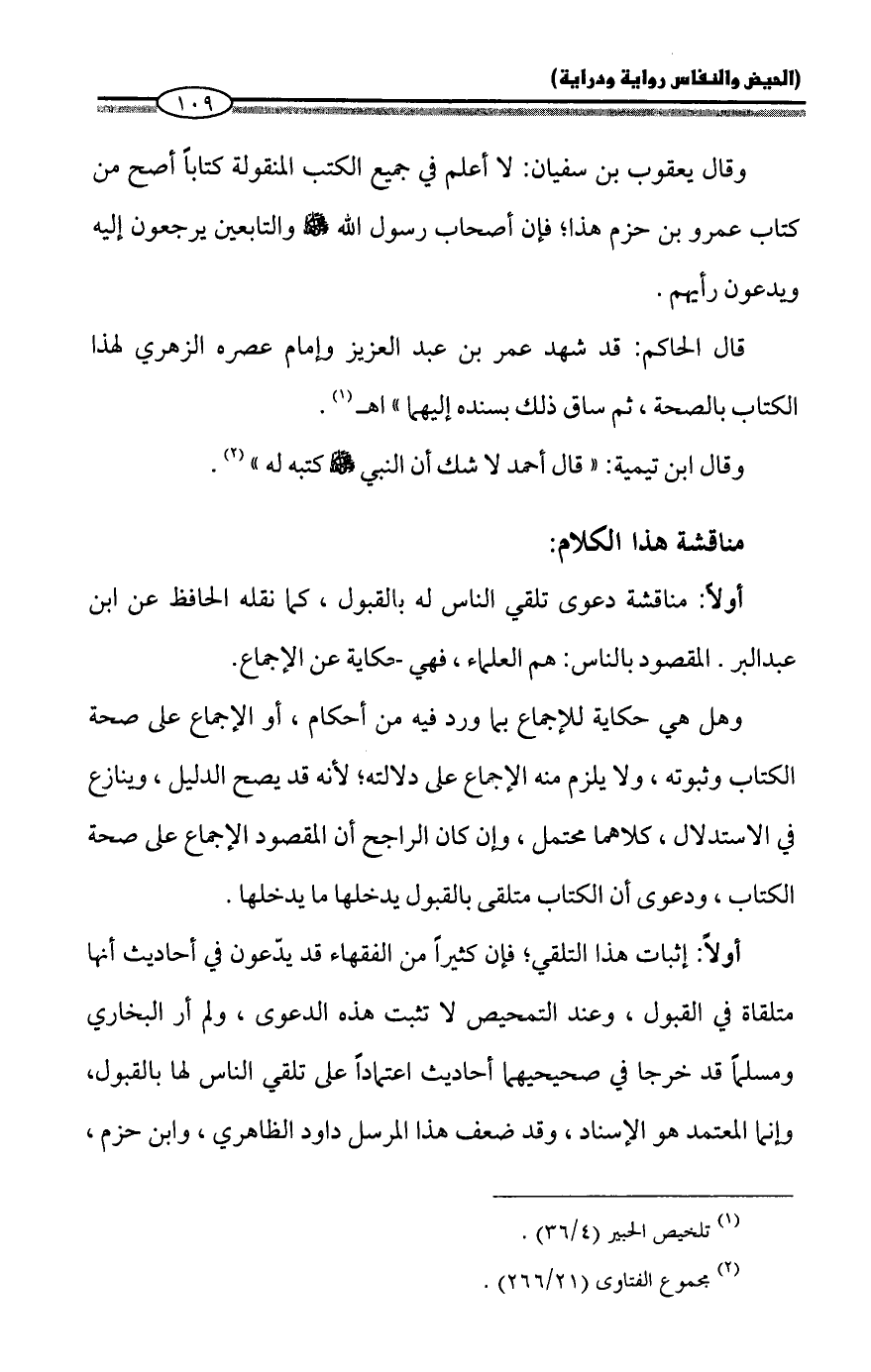 أولاً: مناقشة دعوى تلقي الناس له بالقبول، كما نقله الحافظ عن ابن عبد البر. المقصود بالناس: هم العلماء، فهي حكاية عن الإجماع.