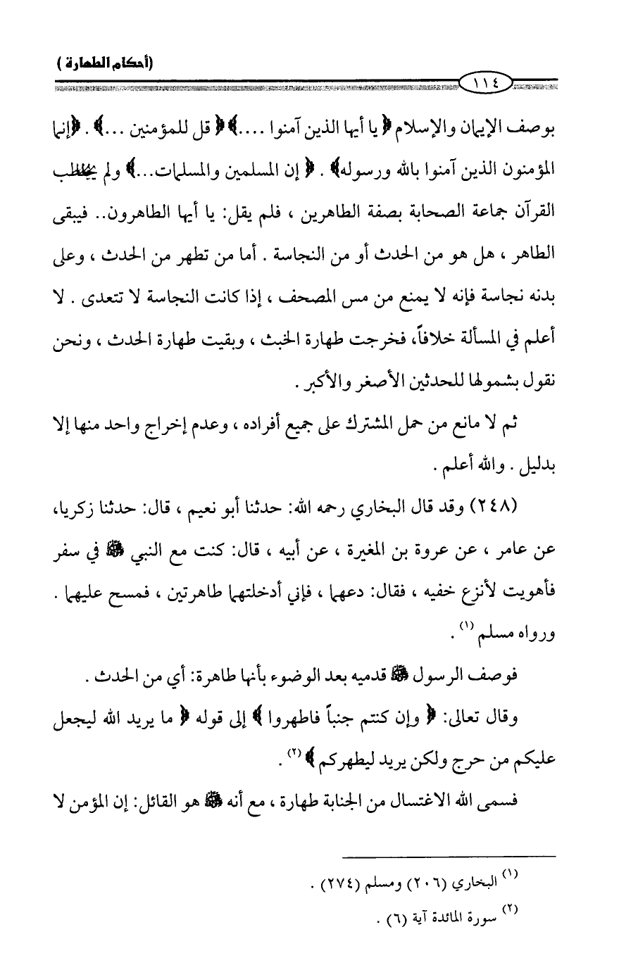 بوصف الإيمان والإسلام {يَاأَيُّهَا الَّذِينَ آمَنُوا ...}. {قُلْ لِلْمُؤْمِنِينَ ...} {إِنَّمَا الْمُؤْمِنُونَ الَّذِينَ آمَنُوا بِاللَّهِ وَرَسُولِهِ ...}. {إِنَّ الْمُسْلِمِينَ وَالْمُسْلِمَاتِ ...} ولم يخاطب القرآن جماعة الصحابة بصفة الطاهرين، فلم يقل: يا أيها الطاهرون .. فيبقى الطاهر، لكل هو من الحدث أو من النجاسة. أنها من تطهر من الحدث، وعلى بدنه نجاسة فإنه لا يمنع من مس المصحف، إذا كانت النجاسة لا تتعدى. لا أعلم في المسألة خلافاً، فخرجت طهارة الخبث، وبقيت طهارة الحدث، ونحن نقول بشمولها للحدثين الأصغر والأكبر.