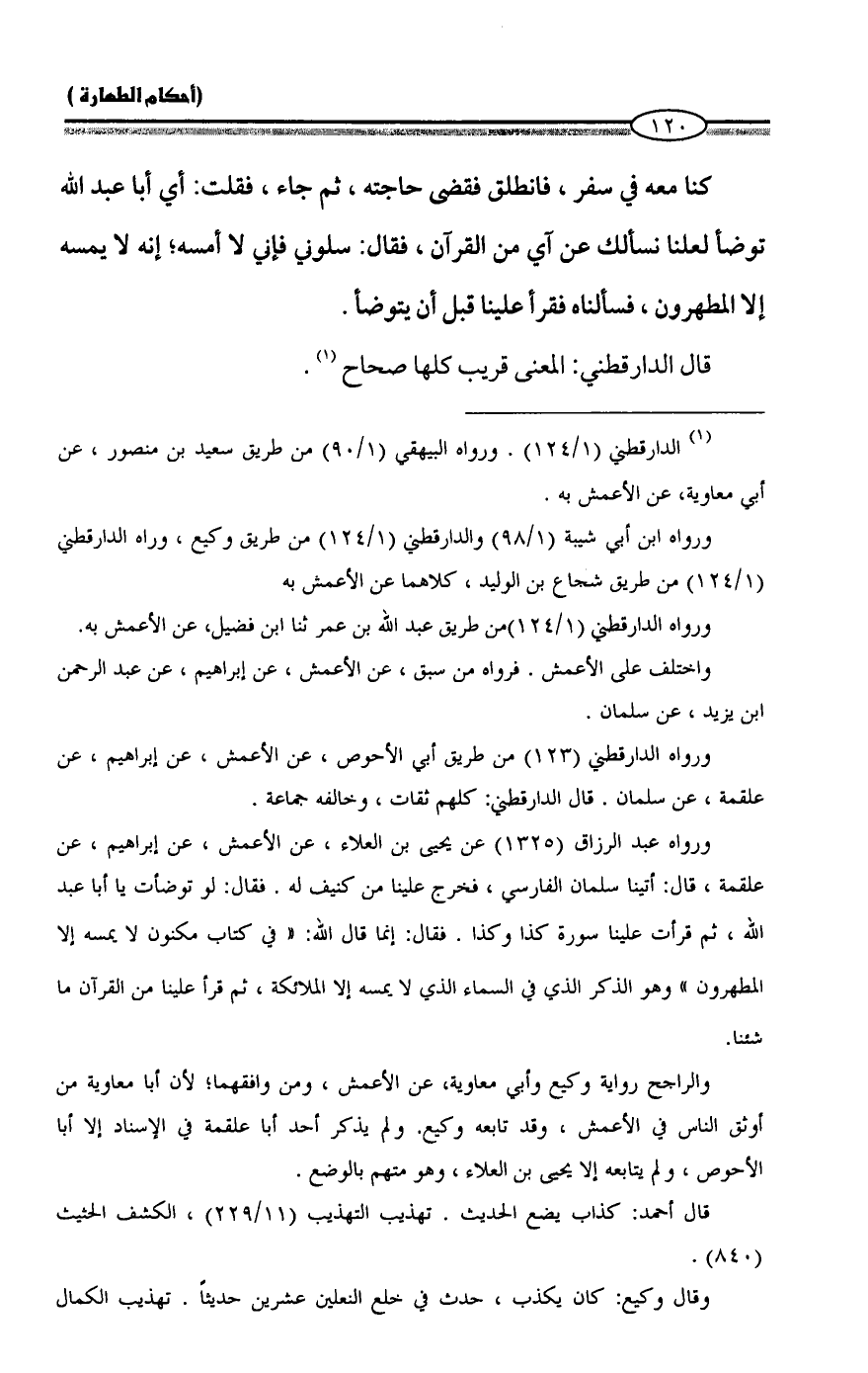 (¬١) الدارقطني (١/ ١٢٤). ورواه البيهقي (١/ ٩٠) من طريق سعيد بن منصور، عن أبى معاوية، عن الأعمش به.
