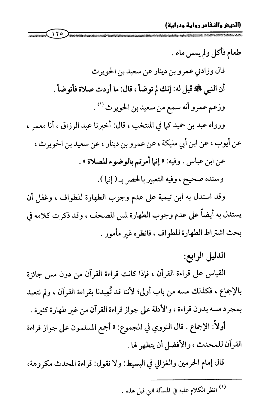 وقد استدل به ابن تيمية على عدم وجوب الطهارة للطواف، وغفل أن يستدل به أيضاً على عدم وجوب الطهارة لمس المصحف، وقد ذكرت كلامه في بحث اشتراط الطهارة للطواف، فانظره غير مأمور.