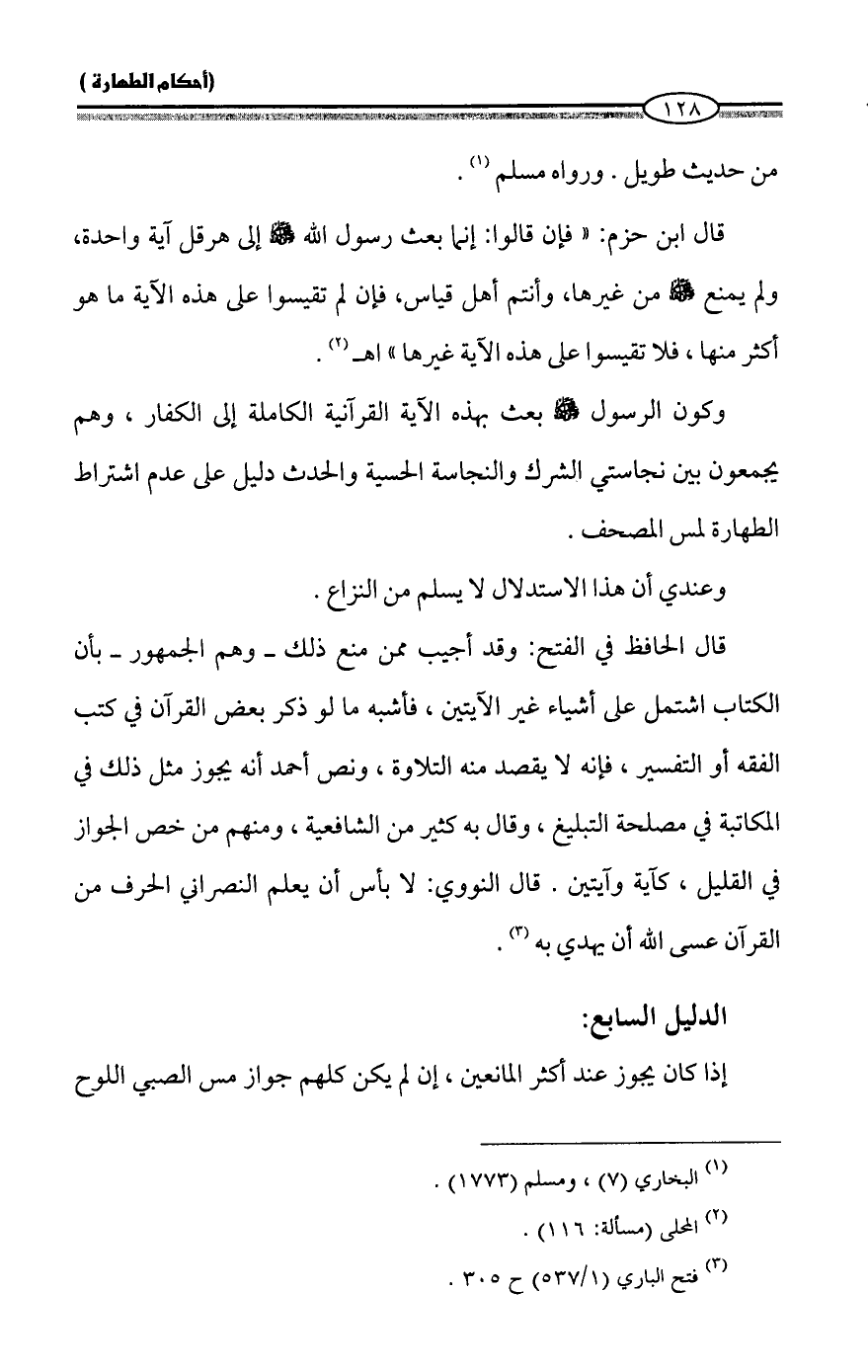 قال الحافظ في الفتح: وقد أجيب ممن منع ذلك - وهم الجمهور - بأن الكتاب اشتمل على أشياء غير الآيتين، فأشبه ما لو ذكر بعض القرآن في كتب الفقه أو التفسير، فإنه لا يقصد منه التلاوة، ونص أحمد أنه يجوز مثل ذلك في المكاتبة في مصلحة التبليغ، وقال به كثير من الشافعية، ومنهم من خص الجواز في القليل، كآية وآيتين. قال النووي: لا بأس أن يعلم النصراني الحرف من القرآن عسى الله أن يهدي به (¬٣).