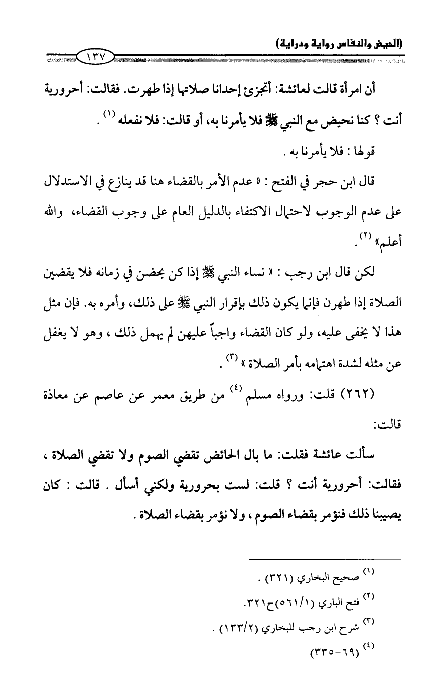 أن امرأة قالت لعائشة: أتجزئ إحدانا صلاتها إذا طهرت. فقالت: أحرورية أنت؟ كنا نحيض مع النبي - صلى الله عليه وسلم - فلا يأمرنا به، أو قالت: فلا نفعله (¬١).