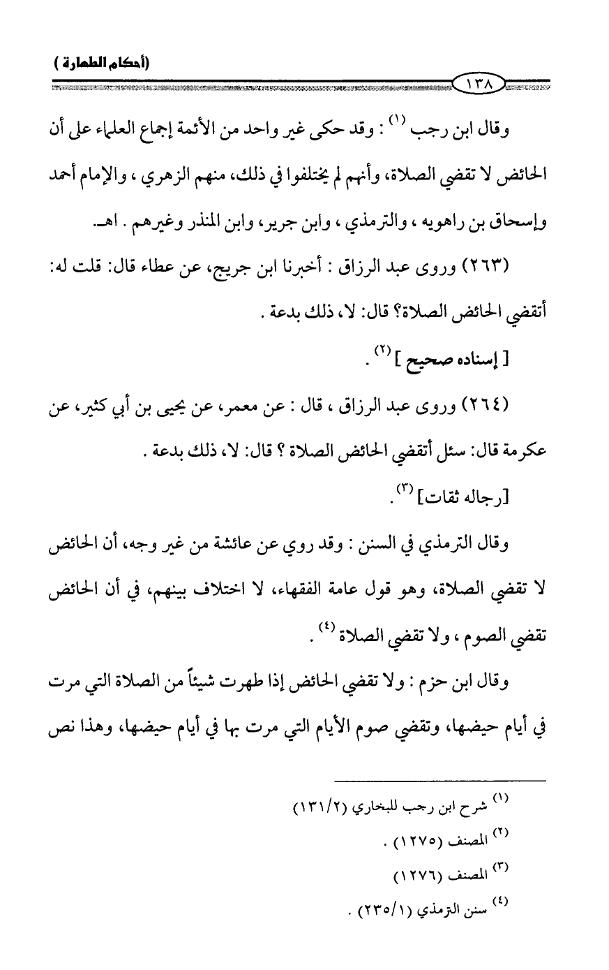 (٢٦٣) وروى عبد الرزاق: أخبرنا ابن جريج، عن عطاء قال: قلت له: أتقضي الحائض الصلاة؟ قال: لا، ذلك بدعة.