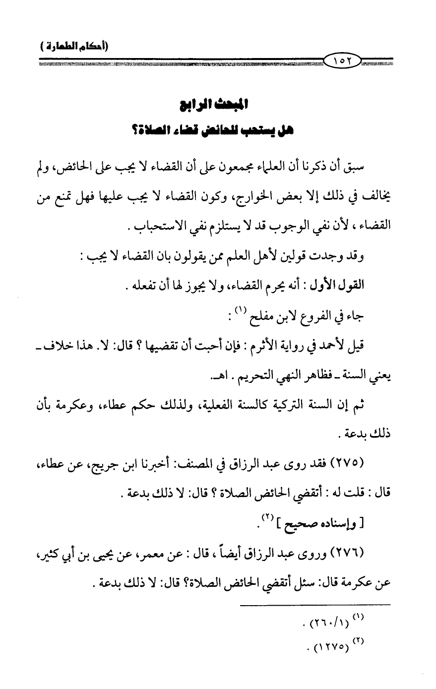 (٢٧٥) فقد روى عبد الرزاق في المصنف: أخبرنا ابن جريج، عن عطاء، قال: قلت له: أتقضي الحائض الصلاة؟ قال: لا ذلك بدعة.