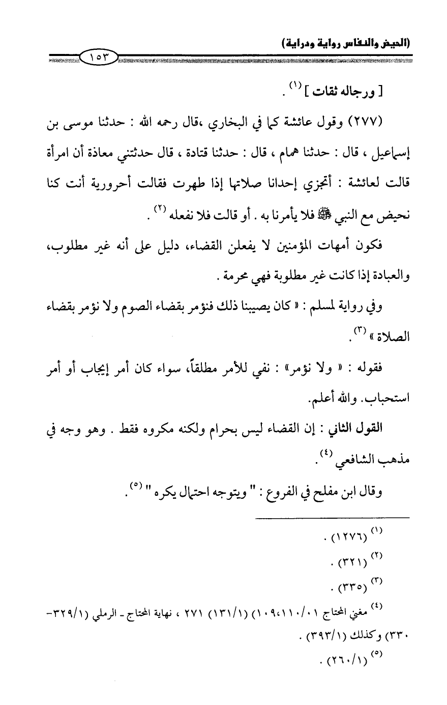 (٢٧٧) وقول عائشة كما في البخاري، قال رحمه الله: حدثنا موسى بن إسماعيل، قال: حدثنا همام، قال: حدثنا قتادة، قال حدثتني معاذة أن امرأة قالت لعائشة: أتجزي إحدانا صلاتها إذا طهرت فقالت أحرورية أنت كنا نحيض مع النبي - صلى الله عليه وسلم - فلا يأمرنا به. أو قالت فلا نفعله (¬٢).