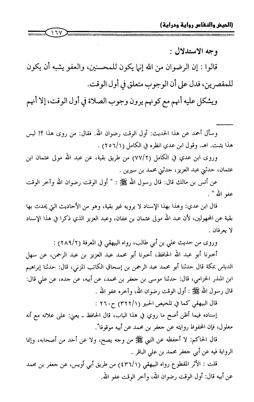 قلت: الأثر المقطوع رواه البيهقي (١/ ٤٣٦) من طريق أبي أويس، عن جعفر بن محمد عن أبيه قال: أول الوقت رضوان الله, وآخر الوقت عفو الله.