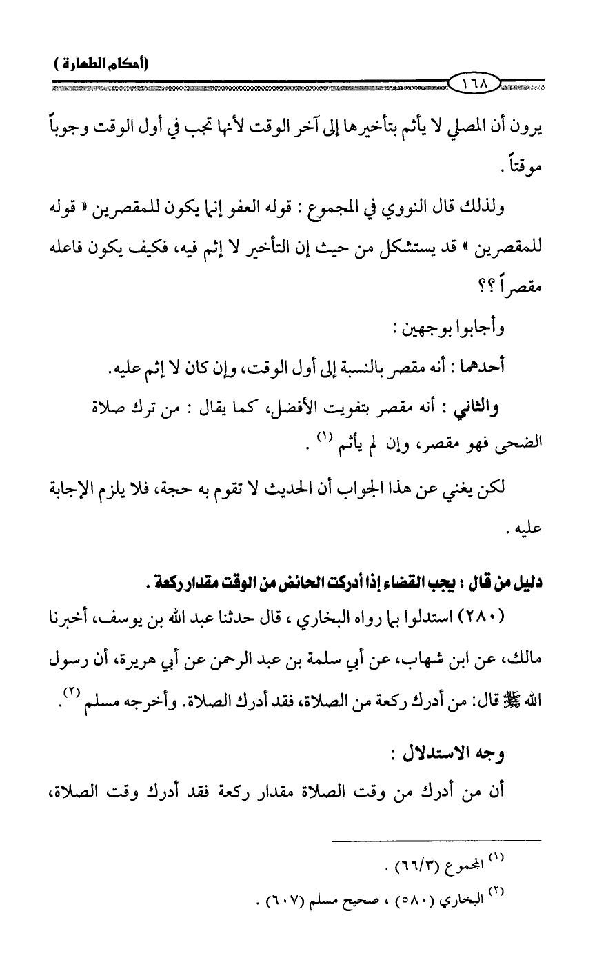 (٢٨٠) استدلوا بما رواه البخاري، قال حدثنا عبد الله بن يوسف، أخبرنا مالك، عن ابن شهاب، عن أبي سلمة بن عبد الرحمن عن أبي هريرة، أن رسول الله - صلى الله عليه وسلم - قال: من أدرك ركعة من الصلاة، فقد أدرك الصلاة. وأخرجه مسلم (¬٢).