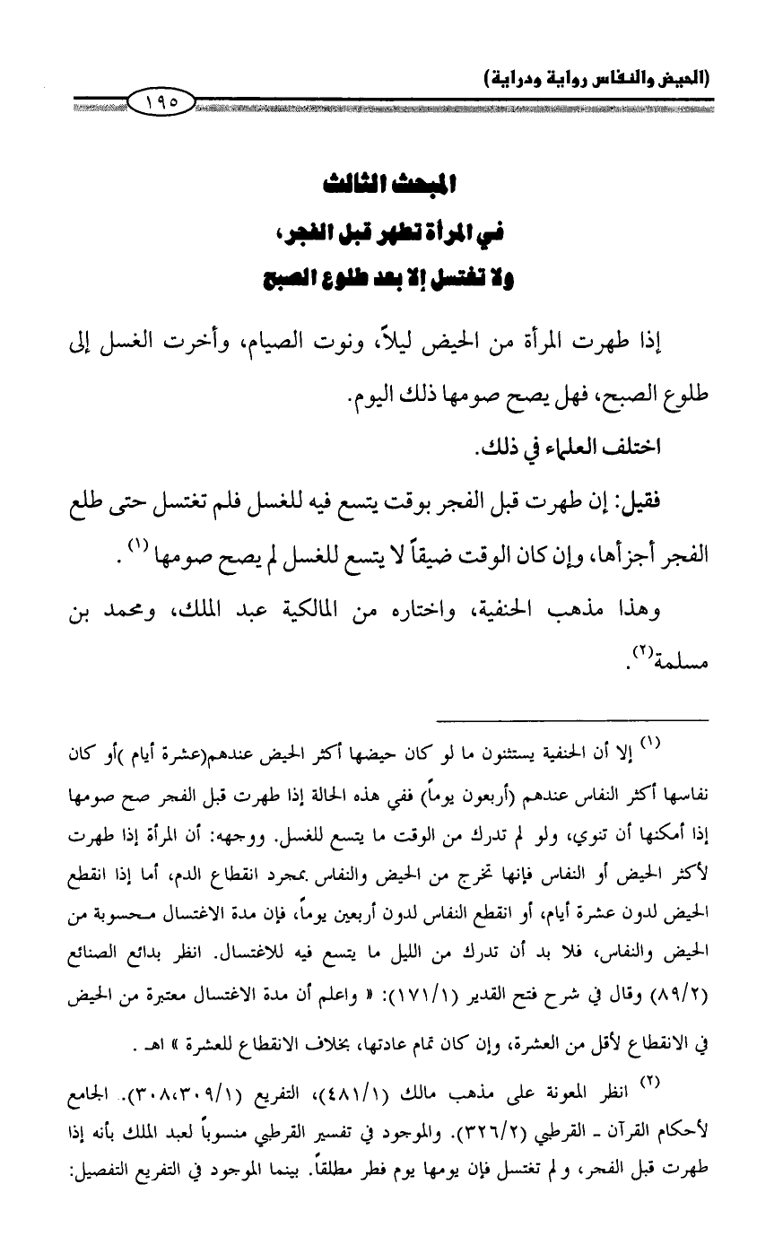 (¬٢) انظر المعونة على مذهب مالك (١/ ٤٨١)، التفريع (١/ ٣٠٩, ٣٠٨). الجامع لأحكام القرآن - القرطبي (٢/ ٣٢٦). والموجود في تفسير القرطبي منسوباً لعبد الملك بأنه إذا طهرت قبل الفجر، ولم تغتسل فإن يومها يوم فطر مطلقاً. بينما الموجود في التفريع التفصيل: